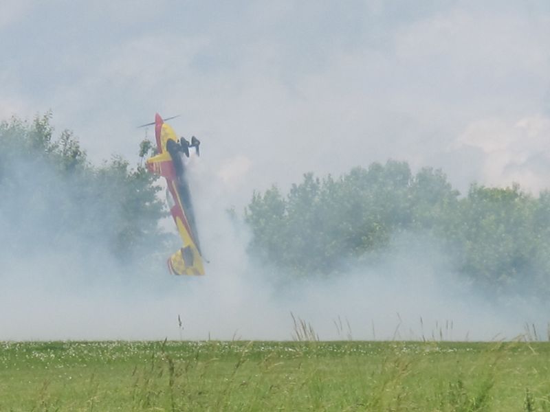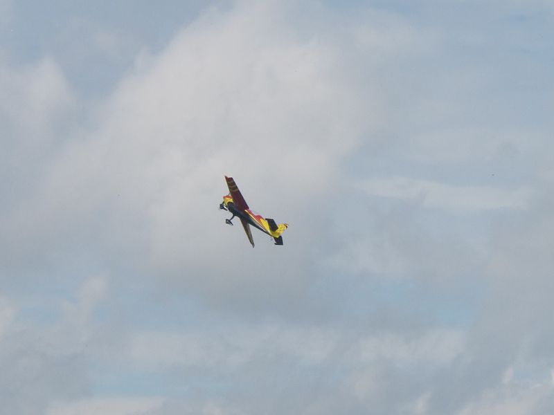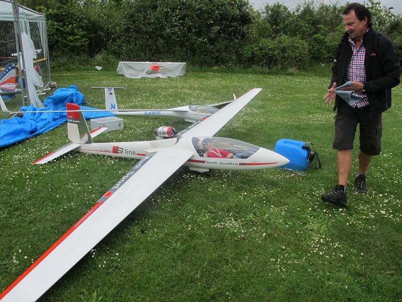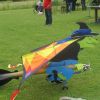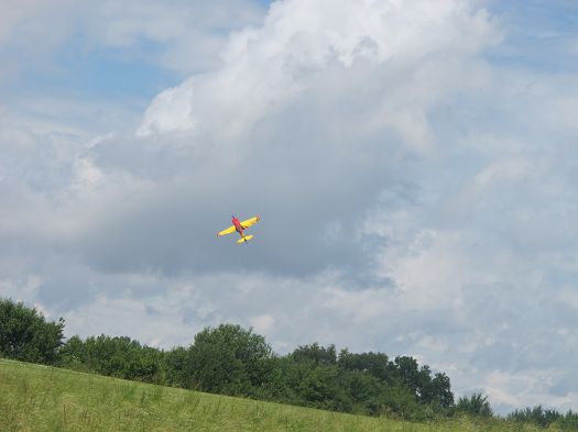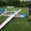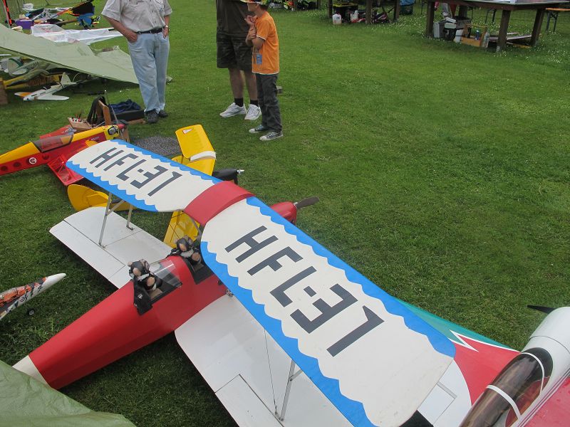 Über Mittag kam leider Regen auf, sodass die wertvollen Modellflugzeuge rasch abgedeckt werden mussten. Nach dem Essen kam aber die Sonne wieder heraus und die Vorführungen konnten beginnen. Eine Drohne brachte ein Segelflugzeug in die Höhe und kuppelte dort ab. Viele verschiedene Modelle, teilweise als Vogelattrappe oder in Hexengestalt wurden vorgestellt. Ein Helikopter zeigte waghalsige Kunststücke, Loopings, Überkopfflüge oder Stillstand in der Luft.
