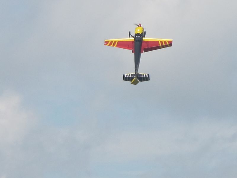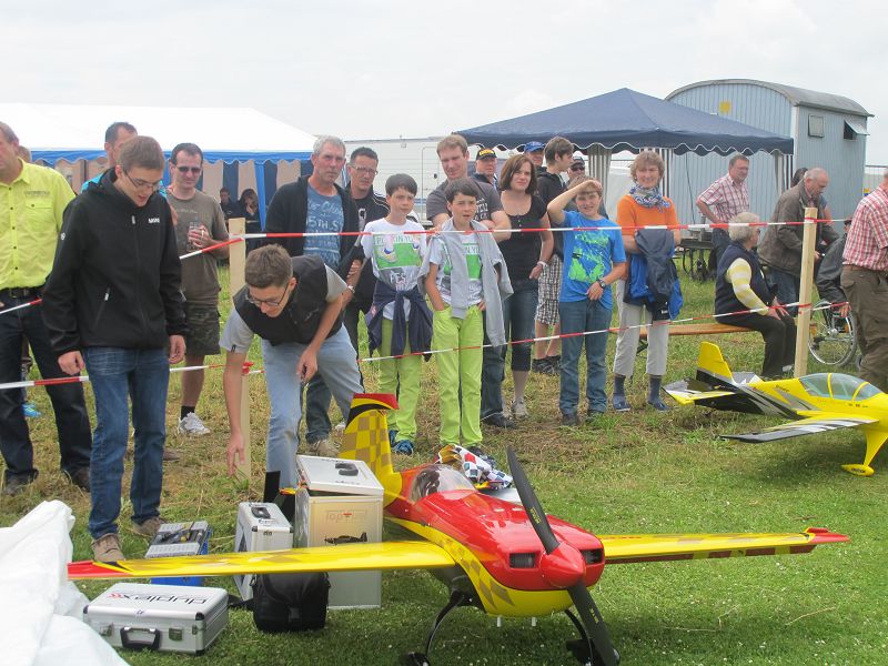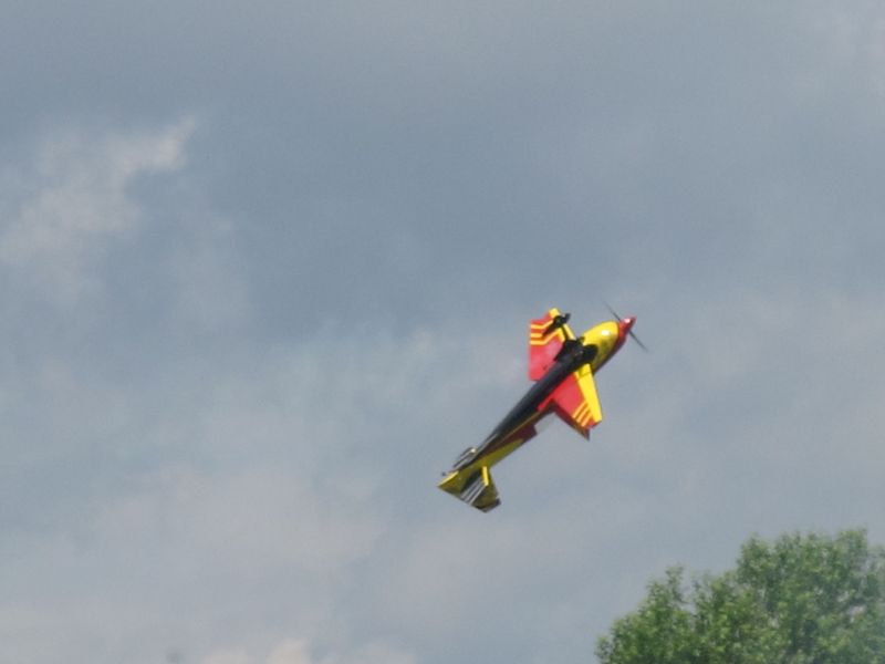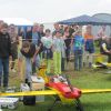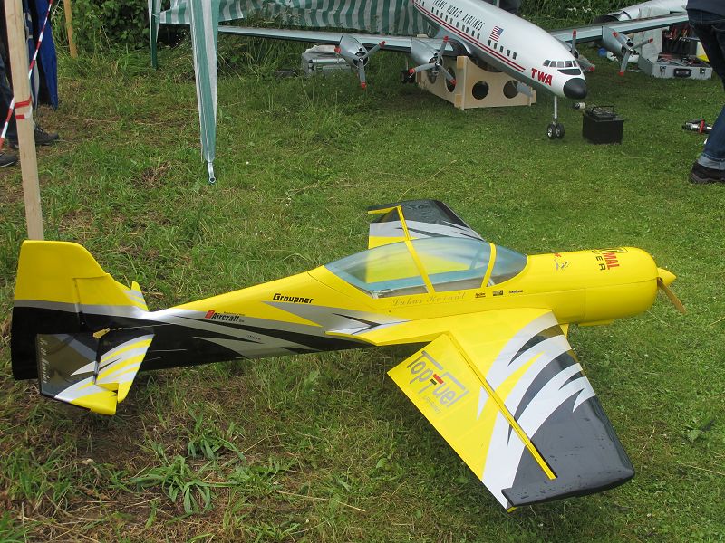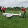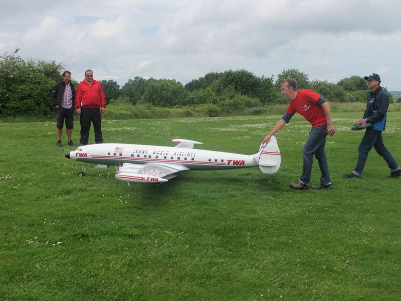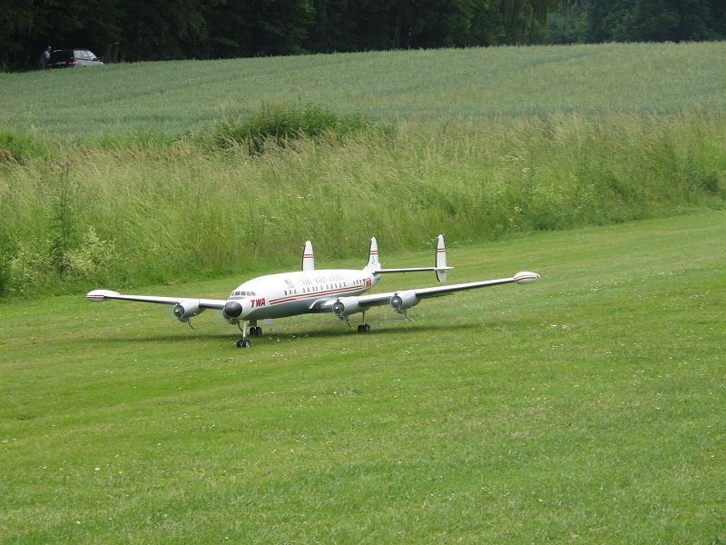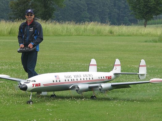 Als Höhepunkt wurde dann das Modellflugzeug von Siegfried Knecht, dem 1.Vorstand des Vereins, vorgestellt. In 1500 Std. Eigenarbeit hergestellt, 3m75 Flügelspannweite, ist es eine genaue Nachbildung der Super Constellation, einem der ersten Transatlantikflugzeuge aus den 50er Jahren. Die 4 Motoren mussten einzeln gestartet werden, bevor das Flugzeug auf der Rasenpiste startete und zahlreiche Runden über den Zuschauern absolvierte. Von weitem kaum von einem echten Flugzeug am Himmel zu unterscheiden. Nach einer perfekten Landung war der Applaus groß und die Zuschauer begeistert. Auch andere der 70 Vereinsmitglieder zeigten noch stolz Kunststücke ihrer Modellflugzeuge und brachten die Leute zum Staunen.