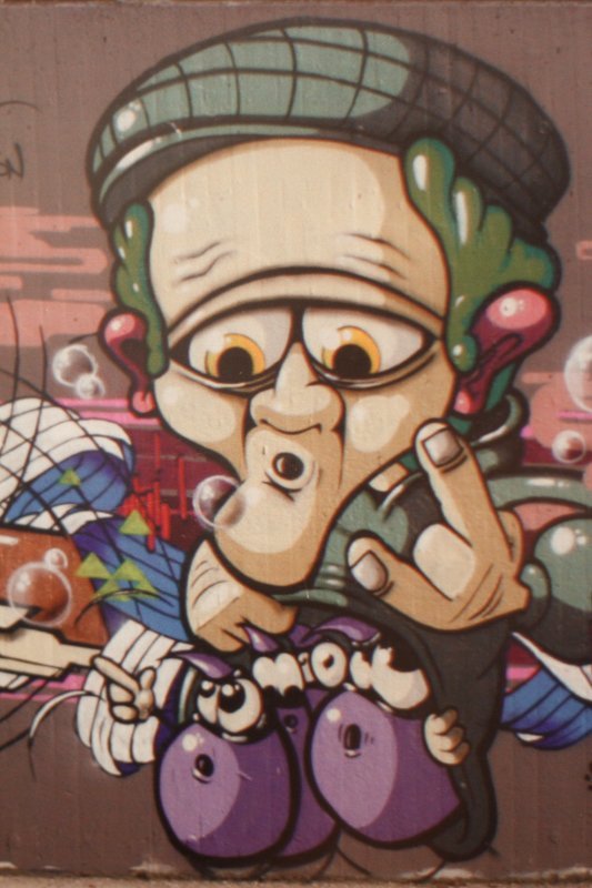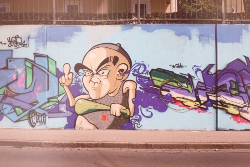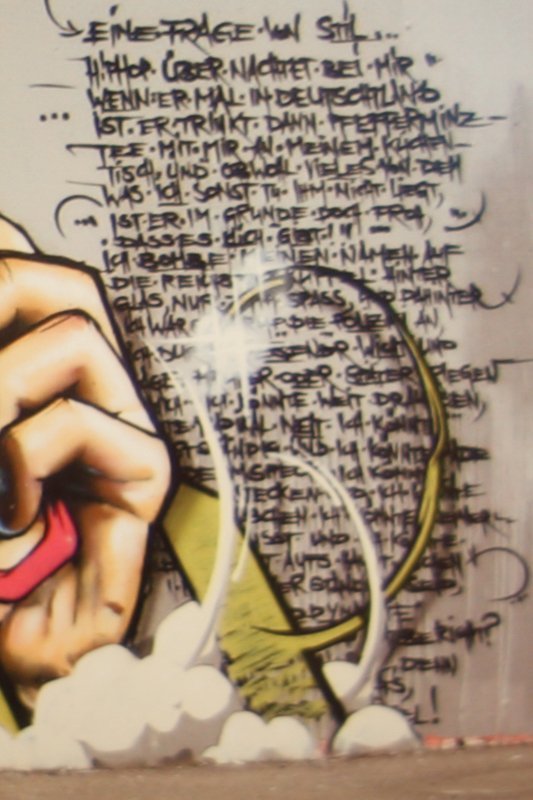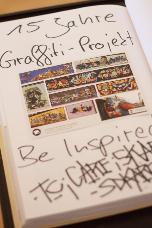 Einen humorvollen Aspekt über den Graffitikult trug Jugendreferent Martin Rohrmann vor: Er erhielt einen anonymen Brief eines Schülers, der sich über Graffitis und deren Sachbeschädigung ausließ. Nicht ganz unerheblich ist dabei zwar die Schadenssumme, die unerlaubte Graffitis in Deutschland jährlich verursachen (rund 200 – 500 Millionen Euro), allerdings kann man nicht in all diesen Fällen davon ausgehen, dass die Sprayer damit immer Straftaten begangen haben. Hier muss man „strafbar“ von „schadensersatzpflichtig“ unterscheiden – in Deutschland entstand so eine „Grauzone“, denn eine Sachbeschädigung wird als ein Eingriff in die Sachsubstanz beschrieben. Dieser Eingriff liegt bei Graffitis allerdings nicht vor, da sie oberflächlich besprüht werden. Ein Sachschaden entstand üblicherweise durch das Entfernen der Werke, die eine Sachbeschädigung mit sich führten. Eine Gesetzesänderung schloss letztendlich diese Lücke – so sind die Sprayer immer mehr auf freie, legal besprühbare Flächen angewiesen.
