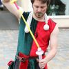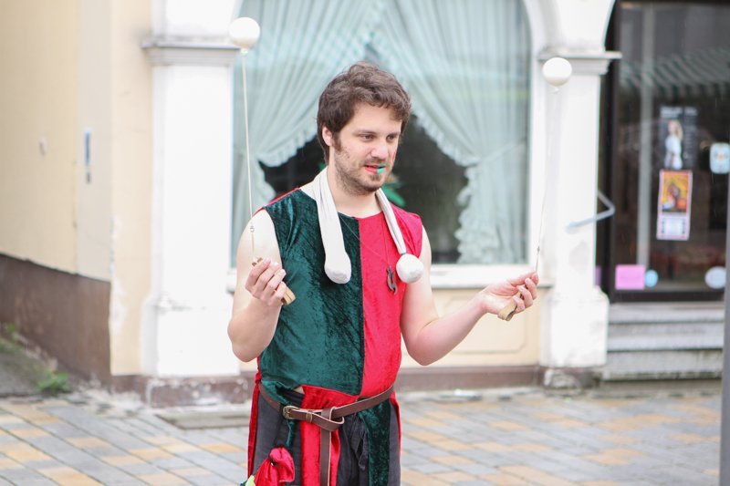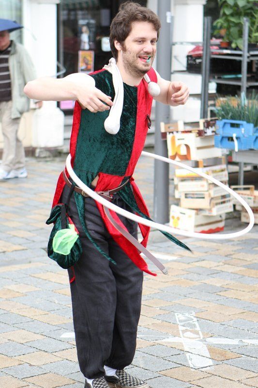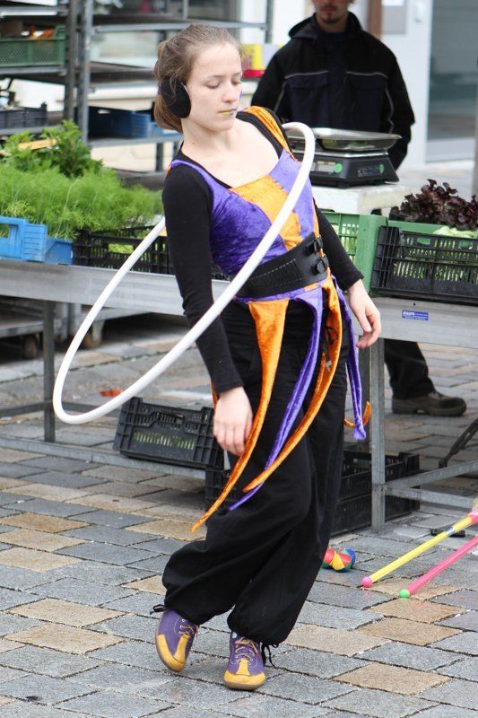 Geyrhalter ist Spezialist für Jonglage und Spinning. Er zeigte das gut bekannte Jonglieren mit zwei oder drei Bällen, hatte allerdings auch Pois zum Schwingen dabei. Ein Poi kann ein in ein Tuch gewickelter Ball sein oder an einem Seil oder einer Kette befestigter Gegenstand. Viele kennen die beliebten Feuershows, bei denen das am Ende schwingende Element zusätzlich angezündet wird. Sara Lang zeigte das Tanzen mit Hula-Hoop-Reifen. Von der Grundschwingung aus kann ein geübter Artist auch mehrere Reifen gleichzeitig schwingen oder die Elemente auf andere Körperregionen als der Hüfte übertragen.