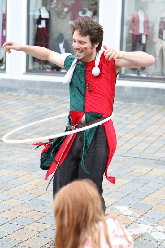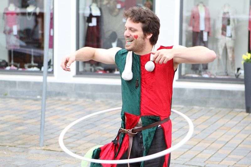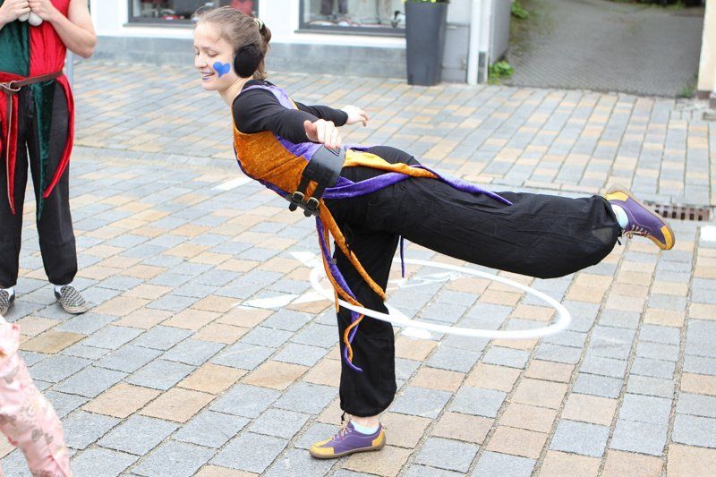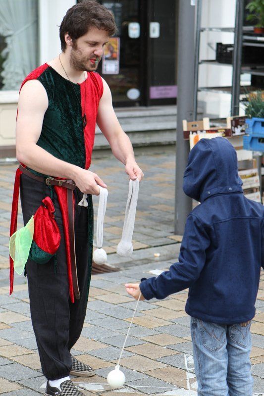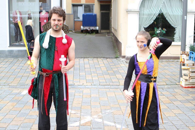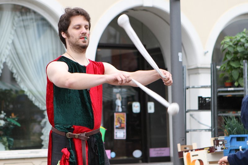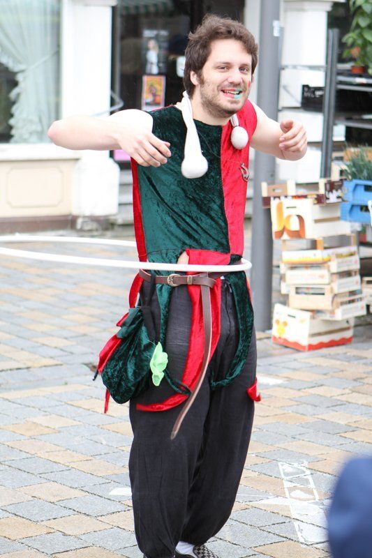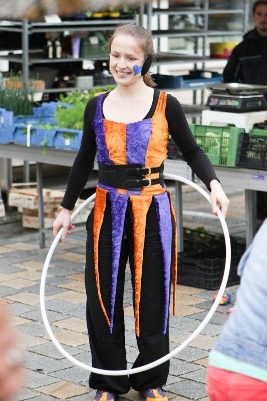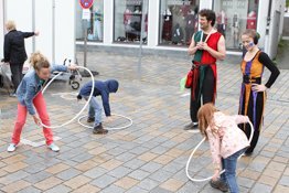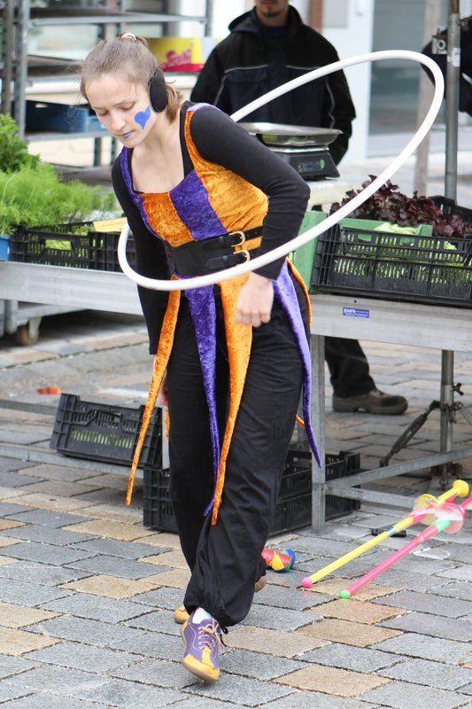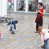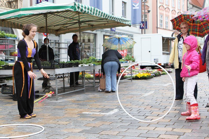 Besuch aus Augsburg bekamen die Pfaffenhofener Wochenmarktbesucher am vergangenen Samstag. Das Künstlerduo „Fantômes de Flammes“ zeigte vor allem den Kindern, wie man spielend Jonglieren und das Tanzen mit dem Hula-Hoop-Reifen lernte.