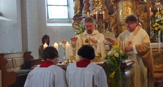 „Seit 25 Jahren bin ich nun im Priesteramt, drei Viertel davon hier in der Pfarreigemeinschaft – anscheinend hat mich der Hopfen doch gekratzt“, so der Jubilar in seiner Predigt. Seine Herzensangelegenheit sei in all den Jahren aber vor allem die Seelsorge gewesen. „Mir war es immer wichtig, am Menschen zu sein“, erklärte Herr Pfarrer Schießl, der auch deutlich machte, dass das Priesteramt zwar immer stärkere Züge eines Managements annimmt, aber ein Punkt für ihn immer Vorrang hat: „Neben all dieser Verwaltung aber, ist es mir ein großes Anliegen, mit und für die Gläubigen da zu sein.“