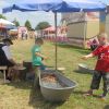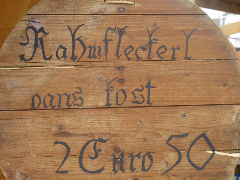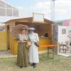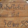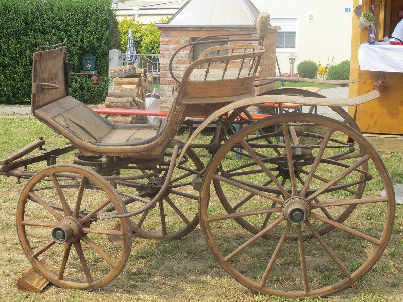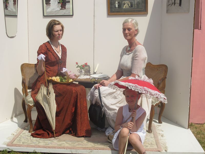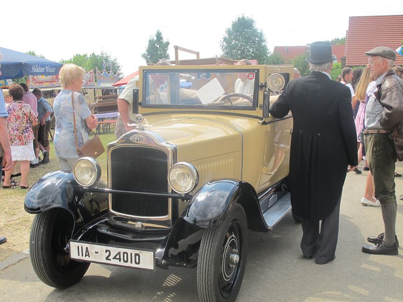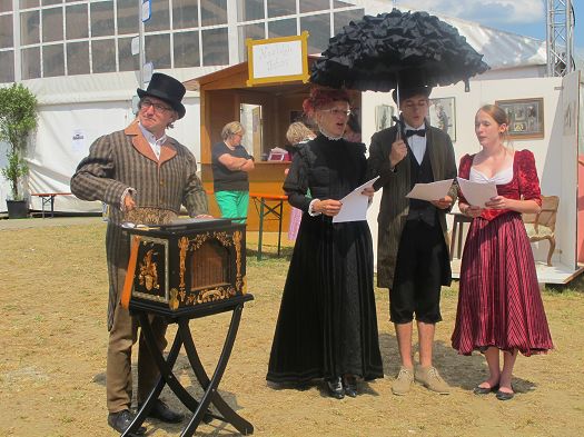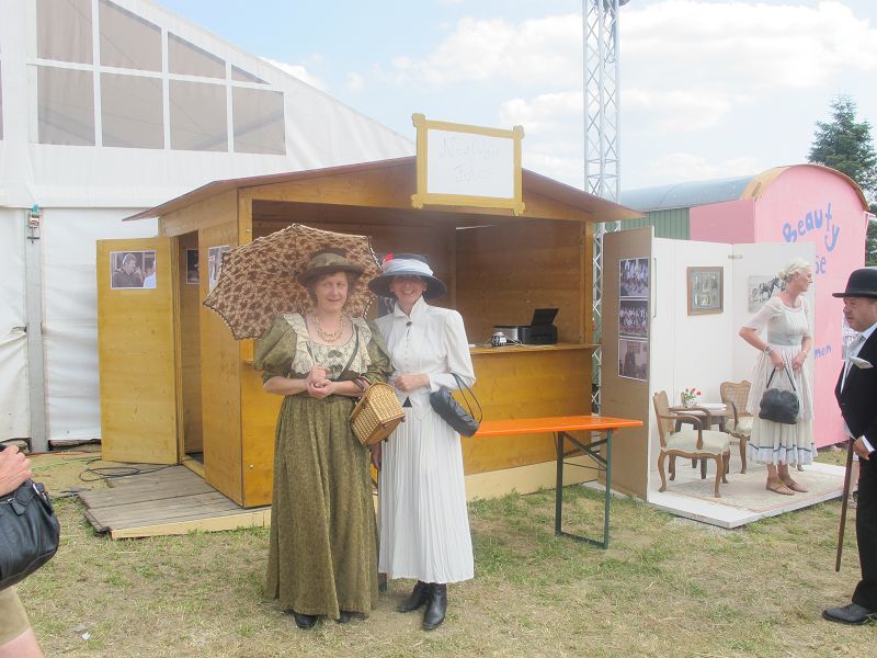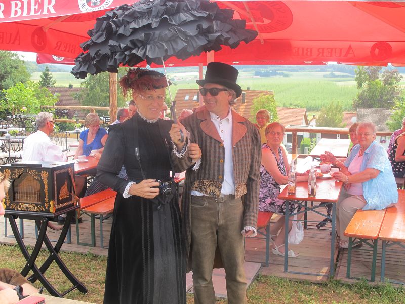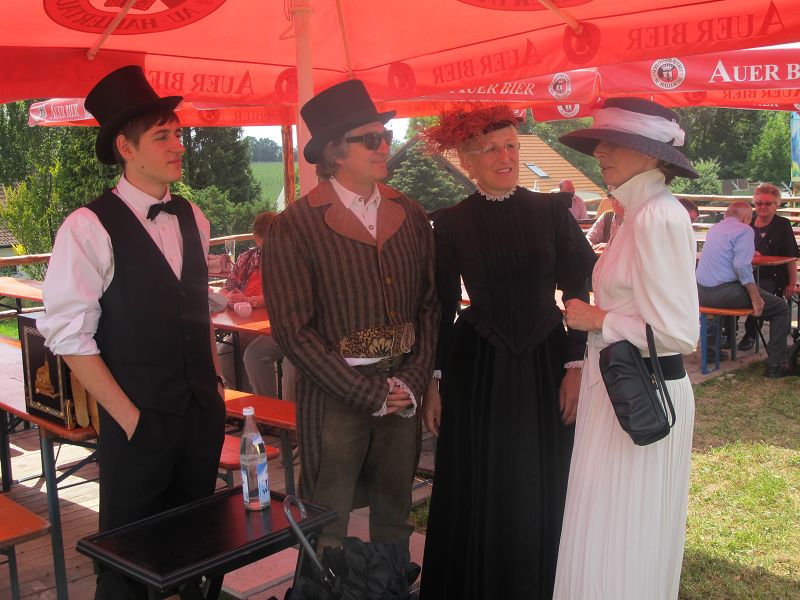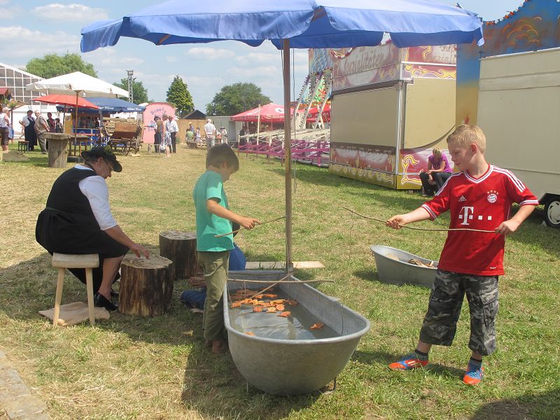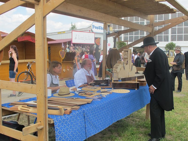 Auch der Platz vor dem Festzelt hatte ein ganz anderes Ambiente: Alte Kutschen, Heuwagen, ein altes Motorrad, allerlei altes Werkzeug und Handwerksstände. Sogar ein altes Photoatelier war aufgebaut, wo man sich im Stil vergangener Zeit fotographieren lassen konnte. Selbst die Spielecke für die Kinder war angepasst: in einer alten Zinkwanne konnte man Holzfische angeln oder mit Holzfiguren auf angemalten Baumstümpfen Mensch-ärgere-dich-nicht spielen.