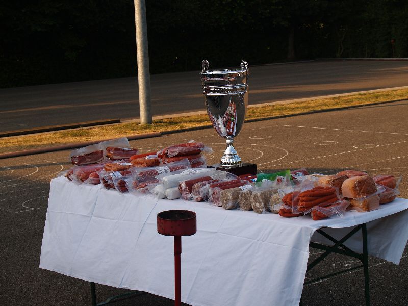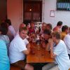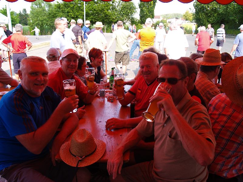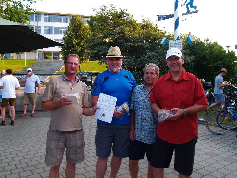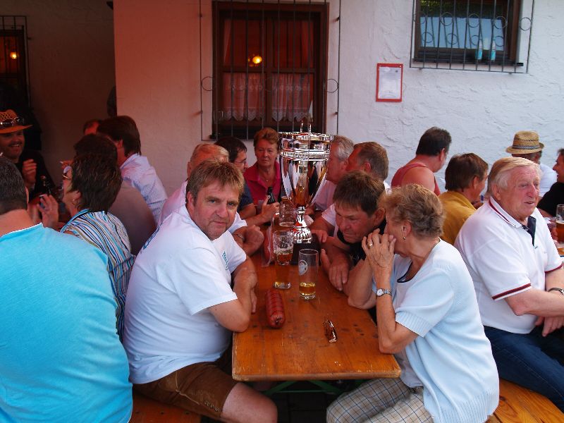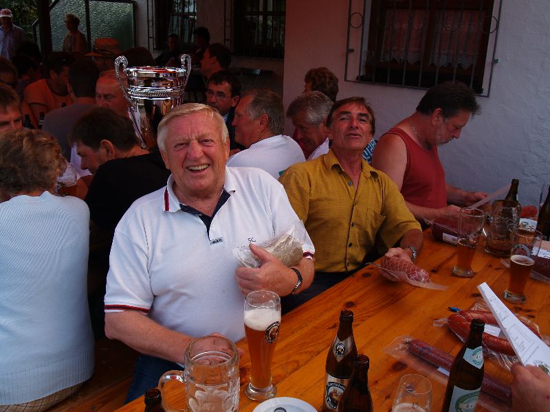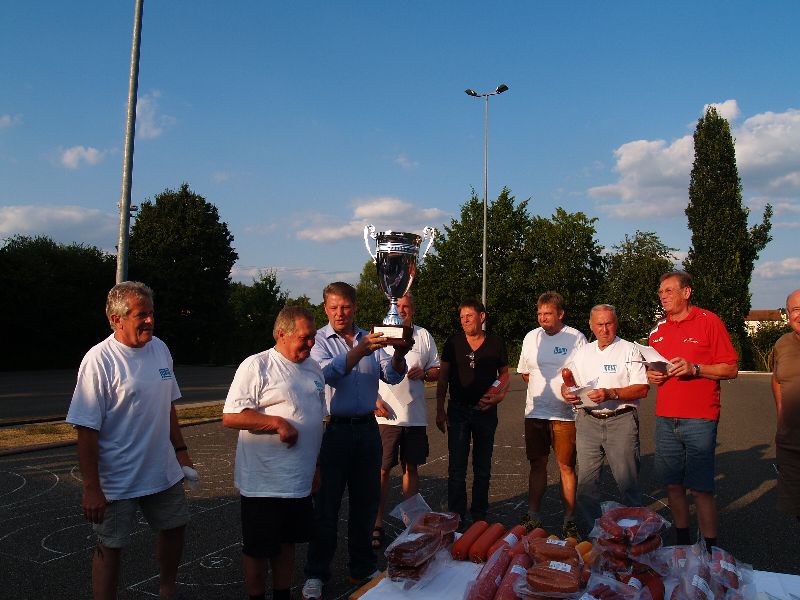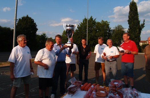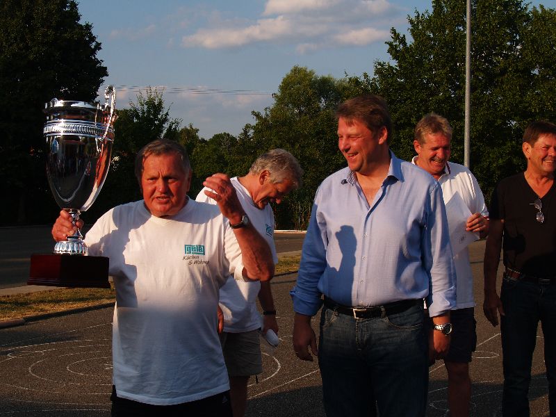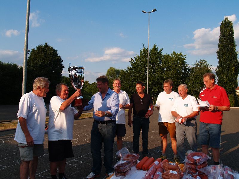 Nachdem die letzten drei Jahre das Team Street-Cafe als Sieger hervorging und den Wanderpokal ganz einheimste, musste in diesem Jahr ein Neuer her. Schirmherr und Bürgermeister Jens Machold hatte im letzten Jahr schon die Stiftung eines neuen Wanderpokals zugesichert und somit konnten die Sieger in diesem Jahr den nagelneuen Pokal entgegennehmen. Zusammen mit den beiden Vorständen Sepp Schmidpeter und Adam Höbler überreichte der Bürgermeister die begehrte Trophäe und stellte die Frage, wie viele Halbe Bier wohl in den Pokal passen. Es sind genau 22 Halbe, da hatte das Siegerteam ja noch Einiges vor sich!