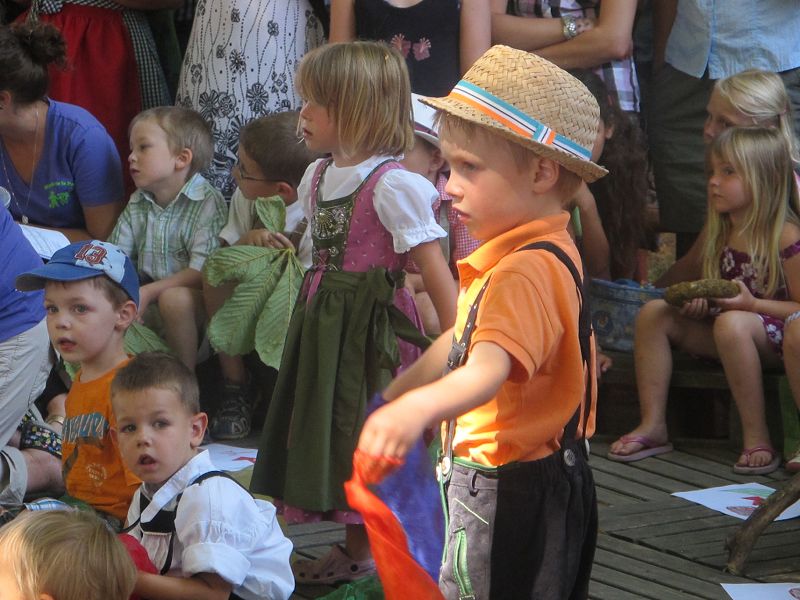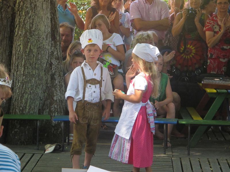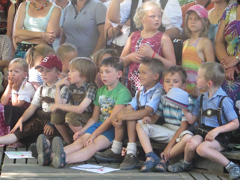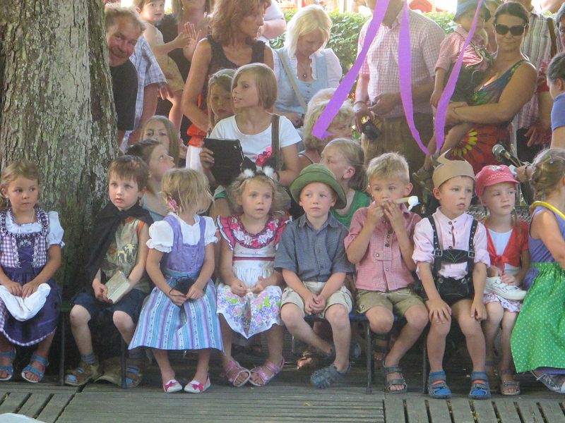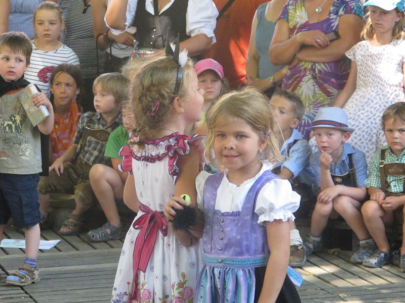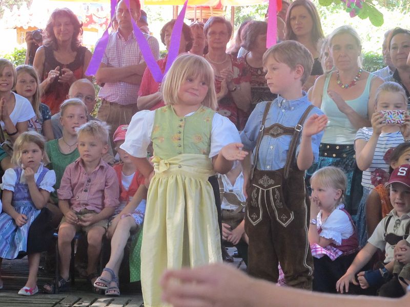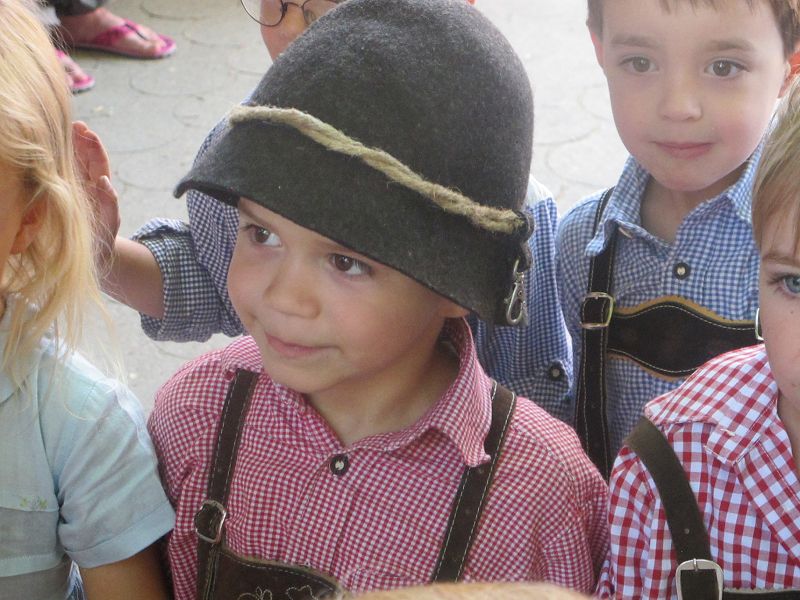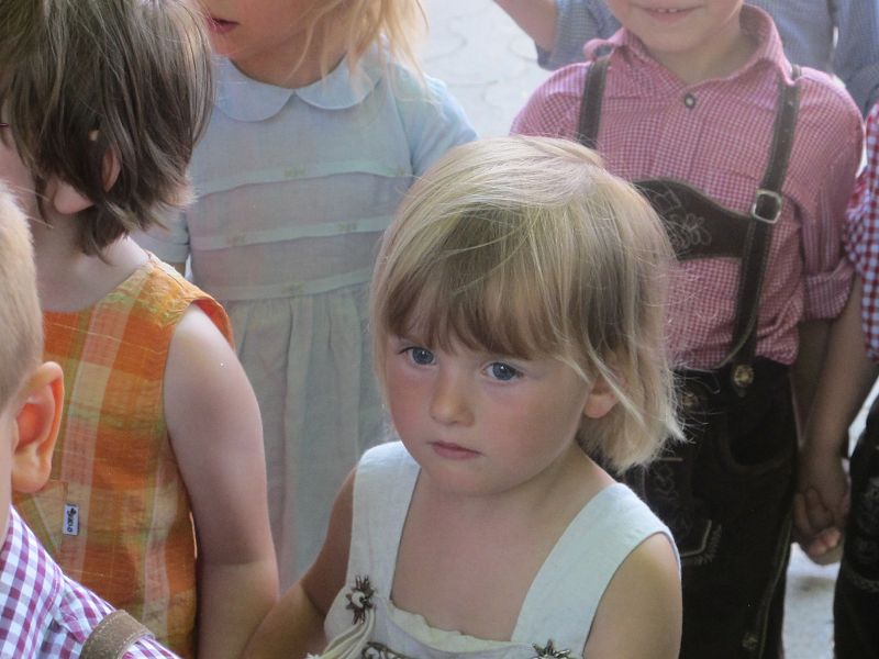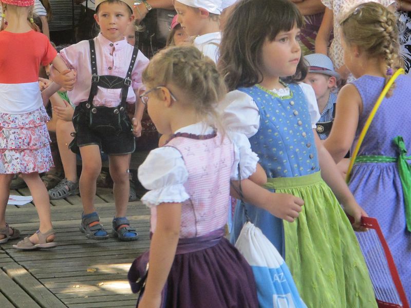 Danach hatten die Kinder ihren großen Auftritt und marschierten in langer Kolonne mit ihren Erzieherinnen und Kinderpflegerinnen aus dem Haus auf eine Bühne unter den wunderschönen alten Kastanien im Garten. Hunderte Besucher säumten das Rund und beklatschten die Auftritte. Da wurden Lieder gesungen, Tüchertänze und sogar ein Bandeltanz aufgeführt, kleine Sketche vorgetragen. Die meisten der Kinder in Dirndl und Lederhose, die stolzen Eltern mit Fotoapparat und Kamera außen herum.