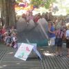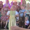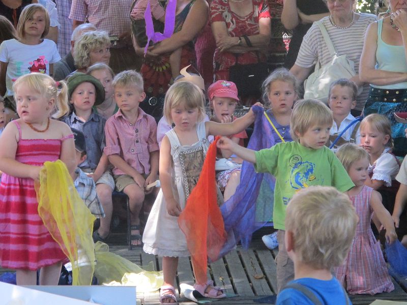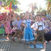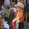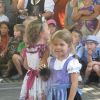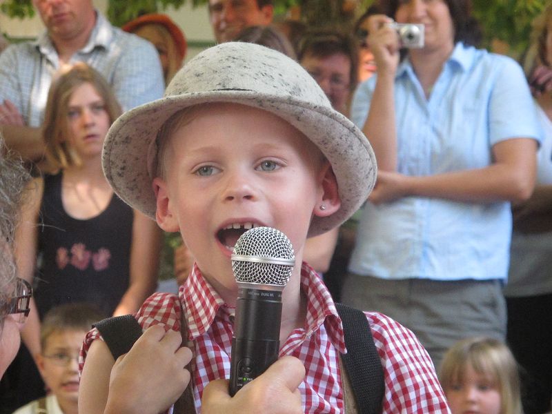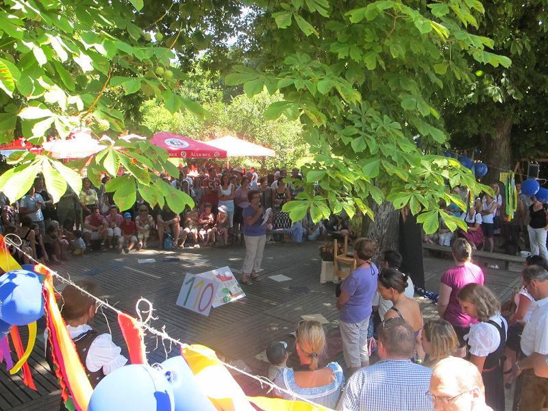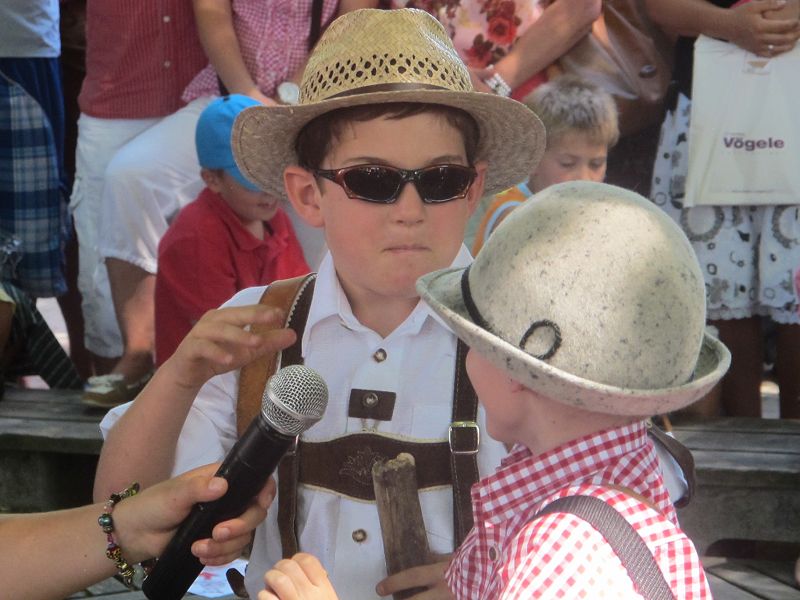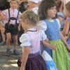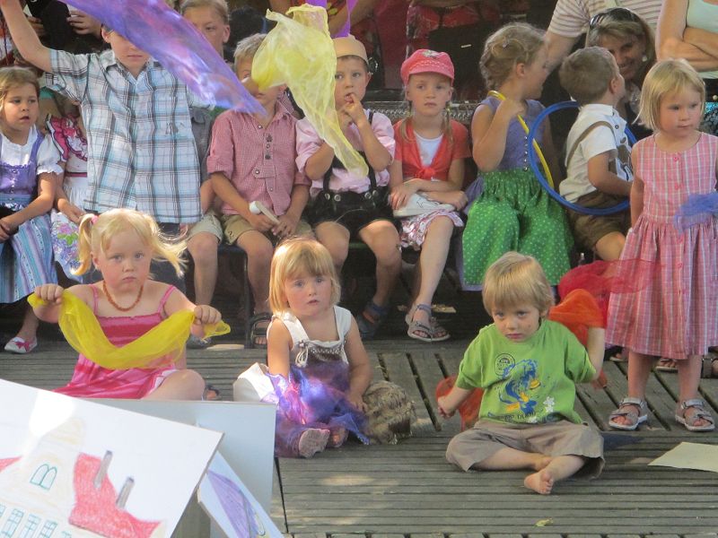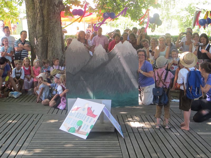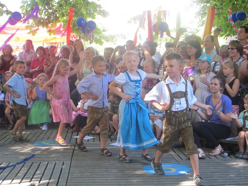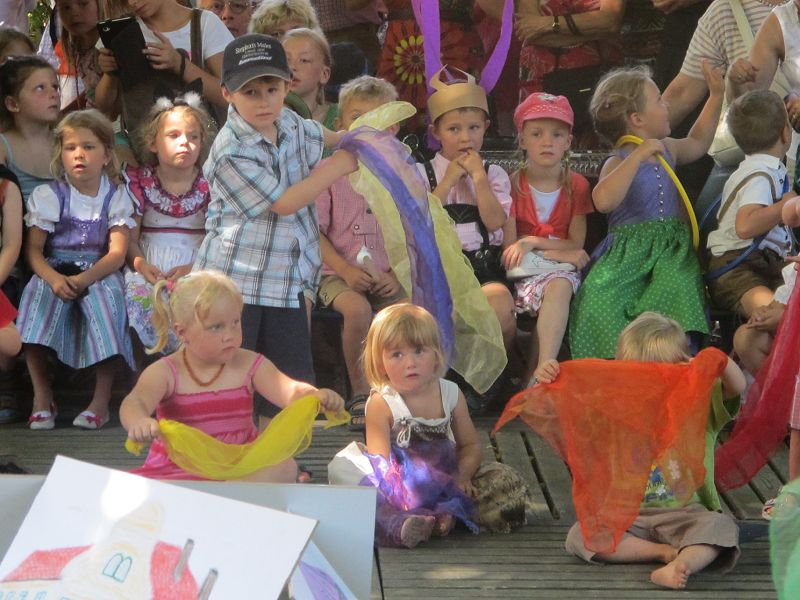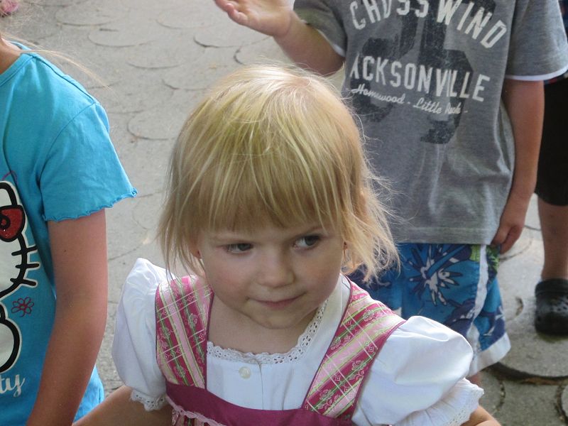 Danach hatten die Kinder ihren großen Auftritt und marschierten in langer Kolonne mit ihren Erzieherinnen und Kinderpflegerinnen aus dem Haus auf eine Bühne unter den wunderschönen alten Kastanien im Garten. Hunderte Besucher säumten das Rund und beklatschten die Auftritte. Da wurden Lieder gesungen, Tüchertänze und sogar ein Bandeltanz aufgeführt, kleine Sketche vorgetragen. Die meisten der Kinder in Dirndl und Lederhose, die stolzen Eltern mit Fotoapparat und Kamera außen herum.