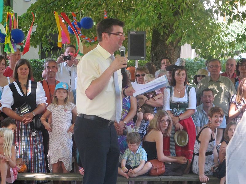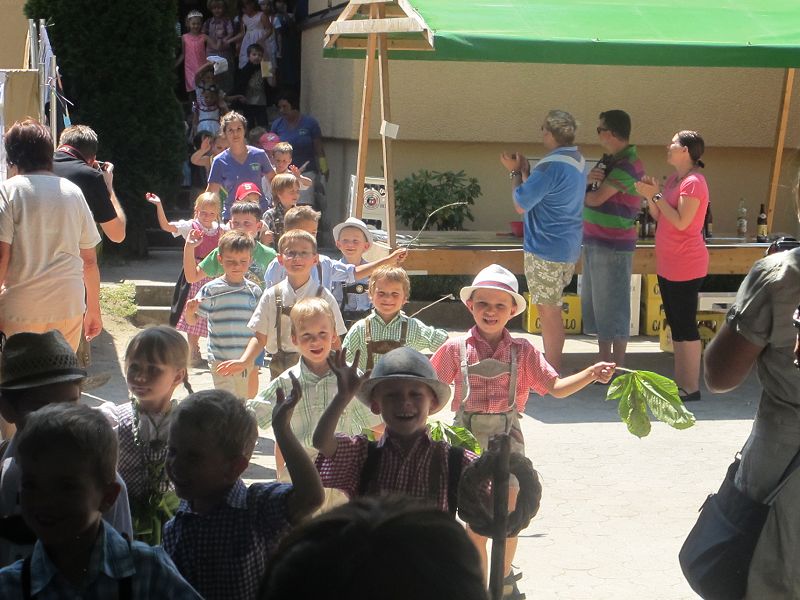 Um 14 Uhr hielt Hausherr Bürgermeister Karl Ecker eine Begrüßungsansprache, hob auch die aufwändige Sanierung des alten Gebäudes im vergangenen Jahr hervor, und wünschte den Kindern weiterhin eine friedliche Oase zum Spielen und Lernen wie schon bei den früheren Generationen in den letzten 110 Jahren.