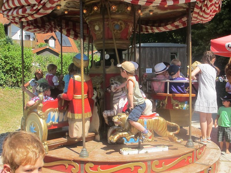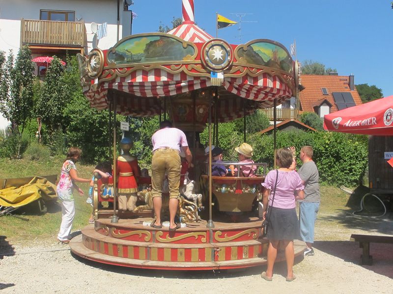Für das leibliche Wohl war bestens gesorgt, Biertische für die Besucher aufgestellt, und rundherum stand alles unter dem Motto "Auer Dult". Da gab es ein altes Kinderkarussell wie aus uralten Zeiten, Losbuden, Ballwerfbuden und Süßigkeitenstände.