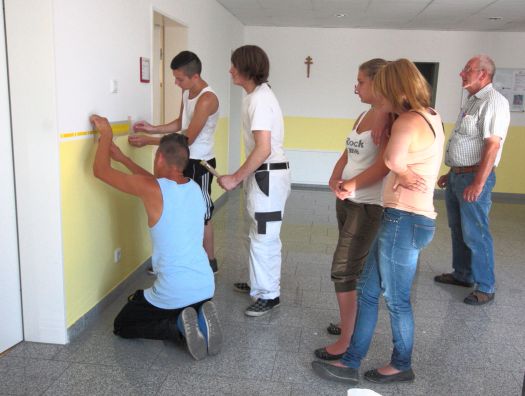 Das neue Caritaszentrum bietet dafür hervorragende Vorrausetzungen: große Türen, einen Aufzug, ausreichend Platz für Rollstuhlfahrer auf ebenen Flächen, Schalter und Griffe in der richtigen Höhe, eine übersichtliche Gestaltung der Innen- und Außenräume sowie eine Beschilderung in leichter Sprache, die bei der Orientierung hilfreich ist. Inklusion bedeutet jedoch mehr als die Gewährleistung von umfassender Barrierefreiheit. Jeder Mensch erhält die Möglichkeit, sich vollständig, selbstbestimmt und gleichberechtigt an allen gesellschaftlichen Prozessen zu beteiligen – und zwar von Anfang an und unabhängig von individuellen Fähigkeiten, ethnischer wie sozialer Herkunft, Geschlecht oder Alter. Für das Mehrgenerationenhaus und die Offenen Hilfen von Regens Wagner sind das Thema Inklusion ein zentraler Baustein ihrer alltäglichen Arbeit. Der von beiden gemeinsam genutzte Eingangsbereich des neuen Caritaszentrums soll zusammen noch freundlicher gestaltet werden. Leiterin des MGH Angela Grill stellt sich die Frage: „Was können wir beitragen und wie kann der Inklusionsgedanke in der Praxis zum Ausdruck kommen?“ Katrin Fischer, Leiterin der Offenen Hilfen weiß hierzu die Antwort: „Jugendliche aus der Regens-Wagner-Berufsschule zur sonderpädagogischen Förderung Schrobenhausen werden die Wände des Foyers streichen. Sie freuen sich, ihre Theoriekenntnisse hier anzuwenden.“ „Die Schüler leisten in Schrobenhausen ein berufsvorbereitendes Jahr, dabei handelt es sich um eine schulische Maßnahme. Sie dauert ein Schuljahr und wird als Vollzeitunterricht in Theorie und Praxis angeboten. Der praktische Unterricht wird besonders wichtig genommen, um die Einbindung der theoretischen Fächer zu erleichtern und um einen Praxisbezug für eine eventuelle spätere Ausbildung herzustellen. Und das passt ja ganz genau und ist wirklich ein echtes Inklusionsprojekt“, erklärt Herr Weyers, stellv. Gesamtleiter von Regens Wagner in Hohenwart. Schnell ist auch klar, was das MGH beisteuern kann: Der offene Handarbeitskreis, der 14-tägig immer mittwochs ab 8 Uhr im MGH unter Leitung von Susanne Shahin stattfindet, bietet an die zwei farblosen Betonsäulen im Eingangsbereich zu umstricken. Begeistert machen sich die Damen ans Werk und das Ergebnis kann sich sehen lassen. Leuchtende Farben machen nun auf dieses ehrenamtliche Angebot aufmerksam. Auch für die Verpflegung der jungen Malertruppe wird vom MGH gesorgt. Die sechs Jugendlichen streichen den Eingangsbereich an zwei Tagen in einem freundlichen Gelbton, ihr Praxisbegleiter Herr Lengle ist mit seinen Schützlingen sehr zufrieden. „Es ist wunderbar, was hier entstanden ist: Die Jugendlichen fühlen sich ernst genommen und gebraucht, und die Brotzeit vom MGH fanden alle auch sehr lecker“, lacht Herr Lengle. Auch Kreisgeschäftsführer des Caritaszentrums Norbert Saam und die Belegschaft sind begeistert: „Nun ist der Eingangsbereich sehr einladend und ansprechend. Eine gelungene Aktion für alle Beteiligten!“