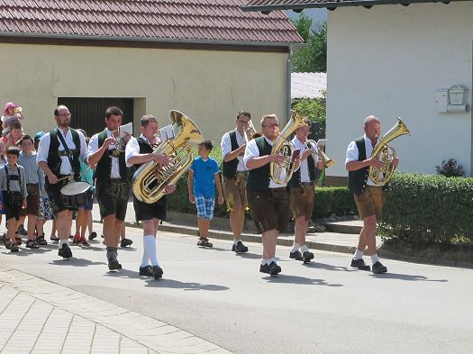 Nach der feierlichen Messe in ihrer Kirche Sankt Bartholomäus zogen die Osterwaaler hinter einer Abteilung der Marktkapelle Au zum neuen Feuerwehrhaus um das Pfarrfest zu feiern. Dabei waren neben dem Pfarrer auch der 1.Bürgermeister aus Au, Karl Ecker, sowie der 2. Bürgermeister, Karl Dreier vertreten.