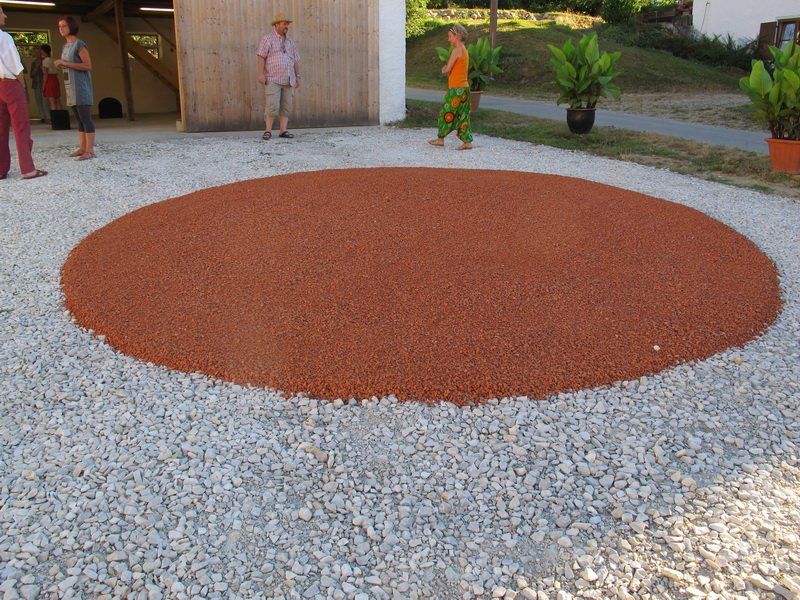 Große Arbeiten im Hof schaffen erste Einblicke, dass hier ganz konsequente Künstler wirken, auch wenn eine Holzskulptur als Bank von den Gästen in Anspruch genommen wurde. Die zwei Ebenen der Scheune gliedern sich auch farblich: im Erdgeschoss nur schwarz, geometrische Grafiken und Bodenskulpturen, im Obergeschoss: rote Arbeiten, ein großer Kreis, innen ebenfalls rot gestrichen. Alles sehr puristisch, klar. Eine echte Galerie. Und das in Hüll! Sabine Ackstaller studierte an der Akademie Halle, Moritz Schweikl in München bei Prof. Pitz.