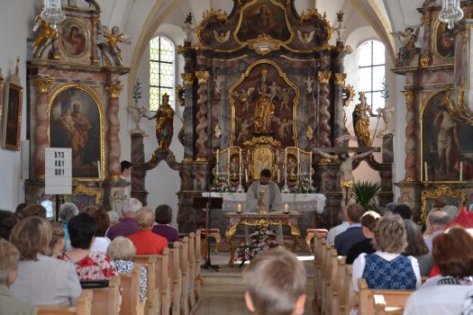 Die katholischen Gläubigen aus Waal und Umgebung feierten am heutigen Donnerstag das Patronatsfest ihrer Kirchenpatronin, der Gottesmutter Maria. Die kleine schmucke Kirche „Maria Himmelfahrt“ war gut besucht, so dass einige stehen mussten oder nur noch draußen zuhören konnten. Das Fest Mariä Himmelfahrt wird schon seit Jahrhunderten gefeiert, auch der Brauch, an diesem Tag Kräuterbüschel zu weihen.
