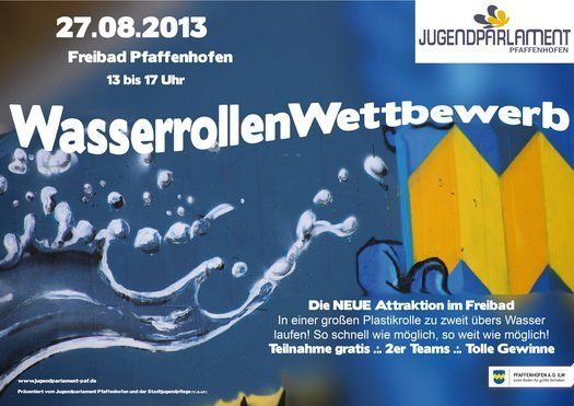 Das Freibad Pfaffenhofen hat eine Attraktion mehr: eine große Wasserrolle wurde angeschafft, mit der man sprichwörtlich übers Wasser laufen kann. Zu zweit einsteigen und ähnlich wie in einem überdimensionierten Hamsterrad losrennen, so könnte diese witzige Rolle beschrieben werden. Das Jugendparlament veranstaltet als Einweihung dieser neuen Errungenschaft der Stadt am Dienstag, den 27.08.2013 im Freibad einen Wettbewerb.