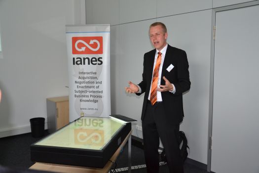 Vorstandsmitglied Nils Meyer demonstrierte anhand eines kleinen Beispiels die Entwicklung eines Geschäftsprozesses auf einem von Metasonic entwickelten Modellierungstisch, auf dem Mitarbeiter mit Hilfe von greifbaren Bausteinen diese Prozesse darstellen können und über einen Editor ohne Programmierkenntnisse in die von Metasonic entwickelte Software integrieren können. Diese Arbeiten können dabei zeitgleich an den verschiedensten Standorten durchgeführt werden.
