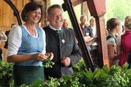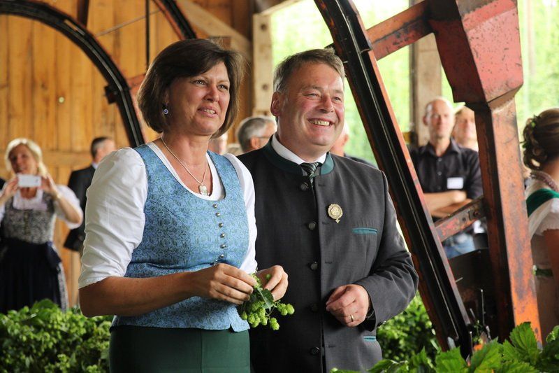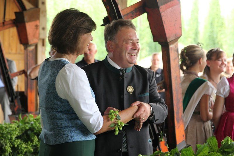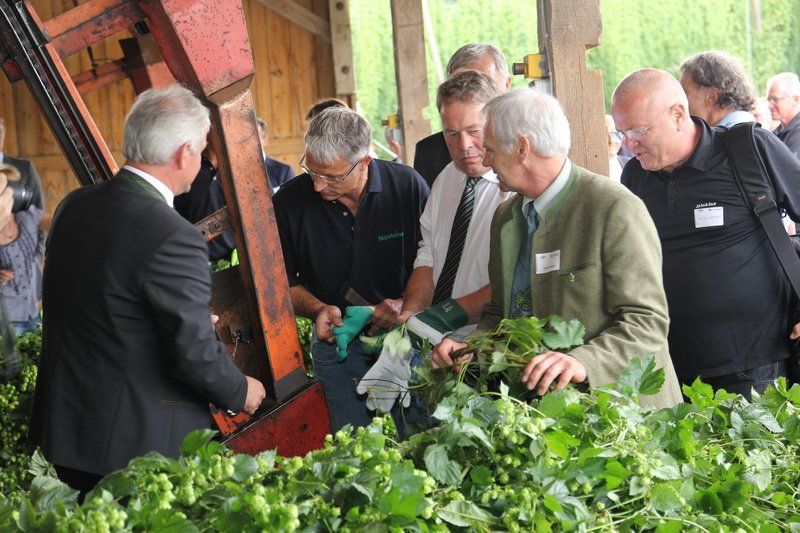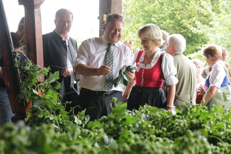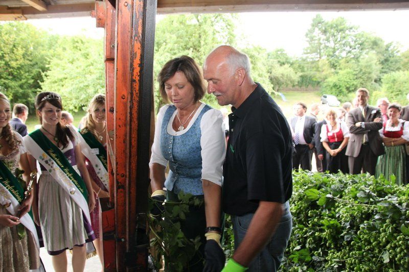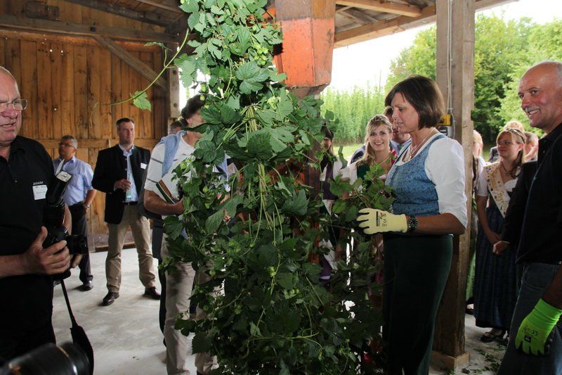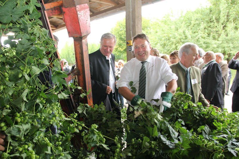 Bevor jedoch der hohe Besuch wieder abreiste, wurde von Bundesministerin Ilse Aigner und Staatsminister Helmut Brunner ganz nach Tradition die Ernteanlage in Betrieb genommen. „Ich freue mich jedes Jahr wieder, dass ich hier den Hopfen einhängen darf“, so Helmut Brunner, der die ersten Reben des Jahres in der Maschine befestigte. Trotz Verspätung wird auch die richtige Hopfenernte nun bald beginnen. Und auch, wenn bei der Hopfenrundfahrt klar wurde, dass dieses Jahr wirtschaftlich schwach sein wird, kann man den Hopfenpflanzern nur eine nun folgende Belebung des Marktes und gute Preise im kommenden Jahr wünschen – denn ohne Hopfen und Bier wäre die Hallertau nicht die Hallertau und Wolnzach auch nicht ihre Hauptstadt.