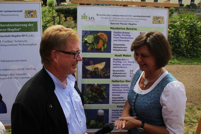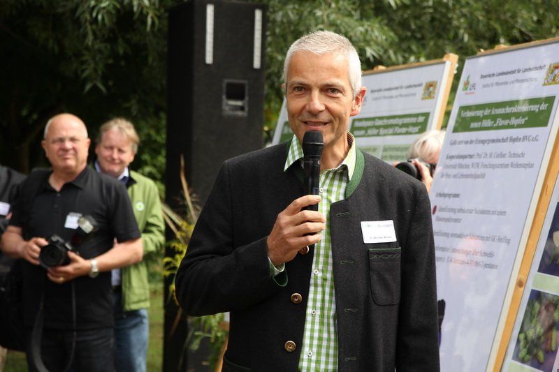 Hier wurden der Verbraucherschutzministerin dann nicht nur die neuen vier Special Flavor Hops-Sorten vorgestellt, sondern auch auf das aktuelle Forschungsprojekt zur Reduktion kupferhaltigen Pflanzenschutzes im ökologischen Hopfenbau aufmerksam gemacht. „Bereits jetzt können wir mit Kupfer-Hydroxiden gute Erfolge erzielen“, erklärte Dr. Florian Weihrauch den versammelten Gästen. Um dem Spannungsfeld zwischen Pflanzen- und Umweltschutz etwas entgegenzusetzten, verfolgt das Projekt dabei das Ziel, den Einsatz von Kupfer von 4 kg/ha im Jahr auf 3 kg/ha im Jahr zu verringern. „Und vielleicht kann die Menge noch weiter reduziert werden, wenn uns entsprechende Forschungsgelder zur Verfügung stehen“, fügte der Forscher mit Blick auf die Bundesministerin hinzu.