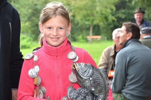 Gerechtigkeitshalber durften bei diesem Wettbewerb auch die Jungfischer wie die Erwachsenen mit maximal zwei Angeln ihr Petri Heil versuchen. Bei Waldemar Stiebert biss ein Karpfen mit 2 200 Gramm Gewicht an, womit er den ersten Platz beim Kameradschaftsfischen belegte und die erste Wahl beim Aussuchen eines Gewinnes hatte. Jungfischerkönigin Corina Schiffelholz angelte sich ebenfalls einen Karpfen, der allerdings brachte nur glatte zwei Kilo auf die Waage - damit wurde sie aber immerhin Zweitplatzierte und durfte sich ebenfalls über einen Preis freuen, den Gewässerwart Peter Rieger überreichte.