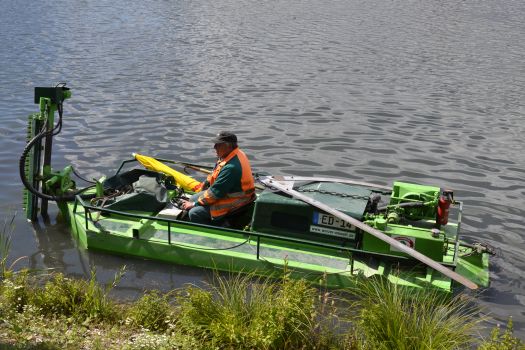 Beim kleinen Gefährt handelte es sich um eine sogenannte Mähkuh, einer Unterwassermähmaschine, die eine V-förmige Schleppsense auf dem Grund des Flutgrabens hinter sich herzog und dabei die in letzter Zeit stark gewachsenen Algen und Unterwasser-pflanzen entfernte, die vom großen Sammelboot mit einem breiten Unterwasser-Rechen und einem Förderband aufgesammelt und vom Greifarm des LKW entladen wurde. Die Maßnahme war sicher auch notwendig, weil durch das letzte Hochwasser Anfang Juni das Algenwachstum zugenommen hatte. Problematisch wird es, wenn die Algen absterben und das Gewässer durch Schlamm und Faulstoffe umzukippen droht. Außerdem kann eine zu starke Algenentwicklung die ohnehin langsame Fließgeschwindigkeit des Flutgrabens beeinträchtigen, den Wasserabfluss bremsen und somit die Hochwasserentlastungsfunktion behindern. Da sich auch Anwohner immer wieder mal beschwert hatten, dass das Wasser des Flutgrabens faulig riecht, war diese Mähmaßnahme sicherlich auch in ihrem Interesse.
