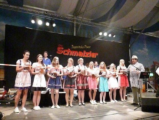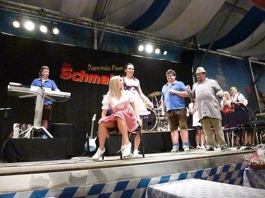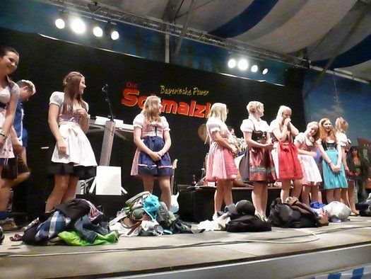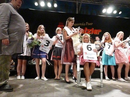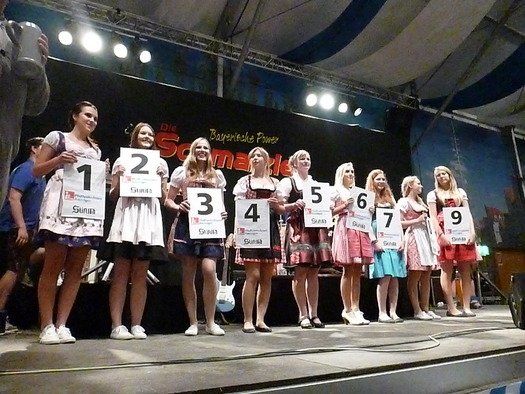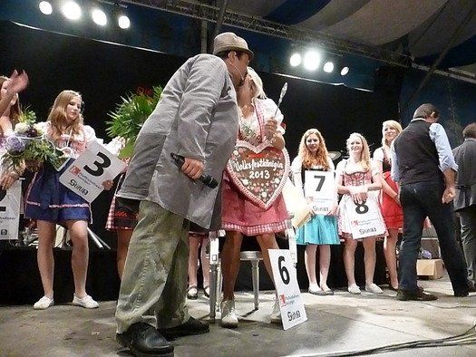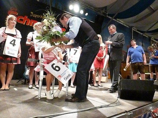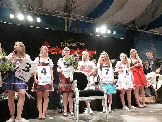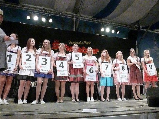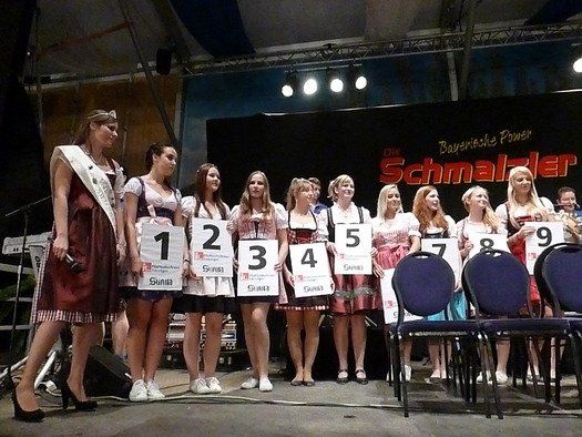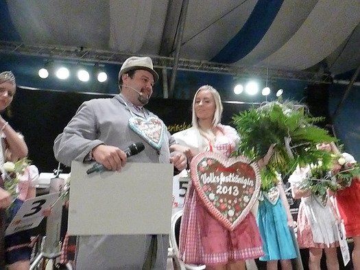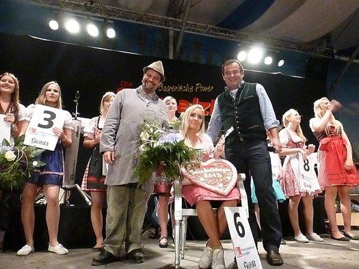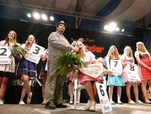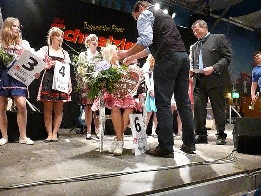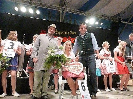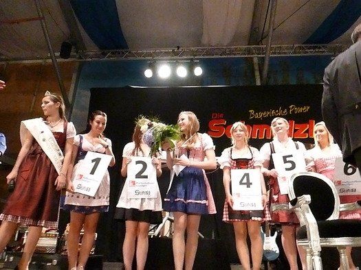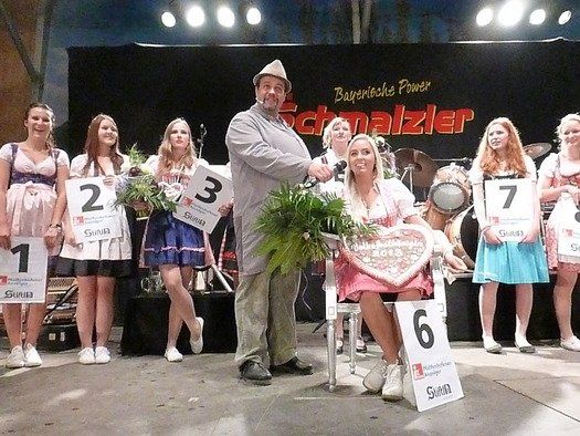 Maßkrug stemmen, Reise nach Jerusalem und Kleidersammeln nach Zeit dienten als lockere, unterhaltsame Wettbewerbe zum Kennenlernen, für das Wahlvolk abgehalten. Studiotechniker Nullinger hatte das selbige hervorragend im Griff, unterstützte die Mädels auch in den Pausen und gab sogar noch eine Gesangseinlage. Bürgermeister Albert Gürtner und Festwirt Lorenz Stiftl gratulierten anständig mit Busserl, Blumenstrauß und Geldpreisen (1. Preis 500,– €, 2. Preis 250,– €, 3. Preis 100,– €).