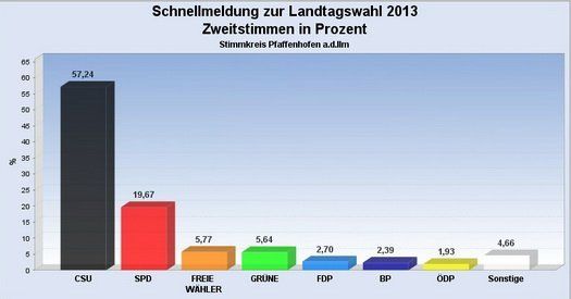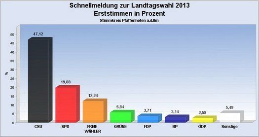 Mit einer Wahlbeteiligung von 66,03 Prozent konnten die Christ-Sozialen 57,24 % der Zweitstimmen im Stimmkreis Pfaffenhofen gewinnen und liegen damit sogar noch über dem bayernweiten Kurs. So gaben die übrigen Wähler des Landkreises 10.185 Stimmen an die SPD, 2.986 Stimmen an die Freien Wähler, 2.921 Stimmen an die Grünen und 1.399 bzw. 2,7 % erhielt die FDP. Auch die Erststimmen halten diese Reihenfolge. 47,12 % der Wahlberechtigten votierten für Karl Straub, 19,88 % für Markus Käser (SPD), 12,24 % für Claudia Jung (FW), 5,84 % für Kerstin Schnapp (Grüne) und 3,71 % für Rainer Daschner (FDP).