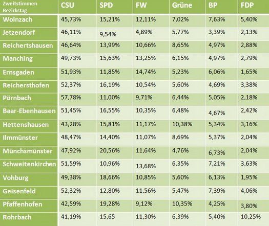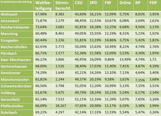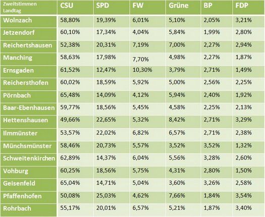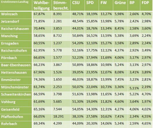 Die Wahl ist vorbei, Karl Straub der eindeutige Sieger und auch die Aufgliederung des Landkreises Pfaffenhofen in seine einzelnen Gemeinden zeigt zwei Tage später: Die CSU hat überall die Nase vorn. Trotz geringer Unterschiede und individuellen Schwerpunkten der 16 Gemeinden des Stimmkreises 125, ist die Tendenz zu Schwarz unübersehbar.
