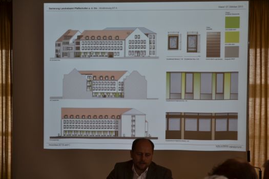 Denn der Teil A steht mit seiner Fassade direkt am Hauptplatz und neben dem denkmalgeschützten „Rentamt“ und da ist Fingerspitzengefühl besonders gefragt, denn es ist das „Gesicht des Landratsamtes“ zum Hauptplatz hin. Nicht nur das Amt für Denkmalspflege wirft ein kritisches Auge auf die geplanten Umbaumaßnahmen, auch die Bürger sind neugierig, wie die jetzige Fassade nach dem Umbau aussehen wird, schließlich sollen 17 Millionen Euro hierfür eingesetzt werden; Kreis- und Stadtrat Roland Dörfler (B´90/Grüne) befürchtet, dass die Bürger sagen „…ist Euch für das viele Geld nix besseres eingefallen?“
