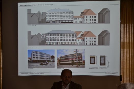 Architekt Benjamin Hardt vom Architekturbüro Köhler aus Gauting stellte den Mitgliedern des Kreisausschusses die Pläne für den Umbau vor. Der Bauteil B am Hofgarten zum Hauptplatz hin erhält ein erweitertes Dach mit Dachgauben, so dass im Obergeschoss genügend Büros untergebracht werden können. Bauteil A erhält wegen des Brandschutzes ein zusätzliches Treppenhaus und im Obergeschoss planen die Architekten einen Sitzungssaal für den Kreistag mit 60 Sitzen und Platz für Zuhörer ein. Dieser Saal soll außerdem teilbar sein für verschiedene Sitzungen und Besprechungen.