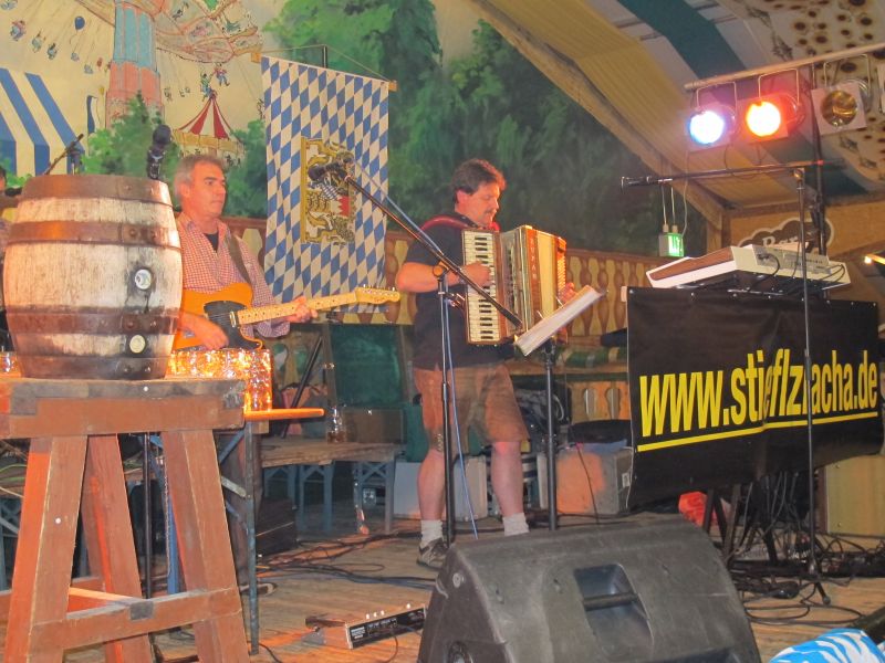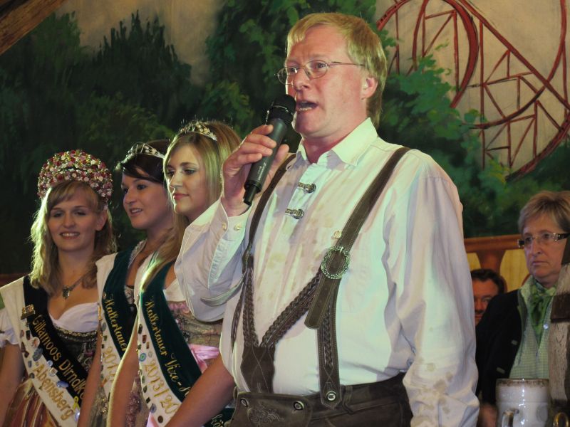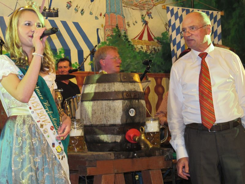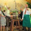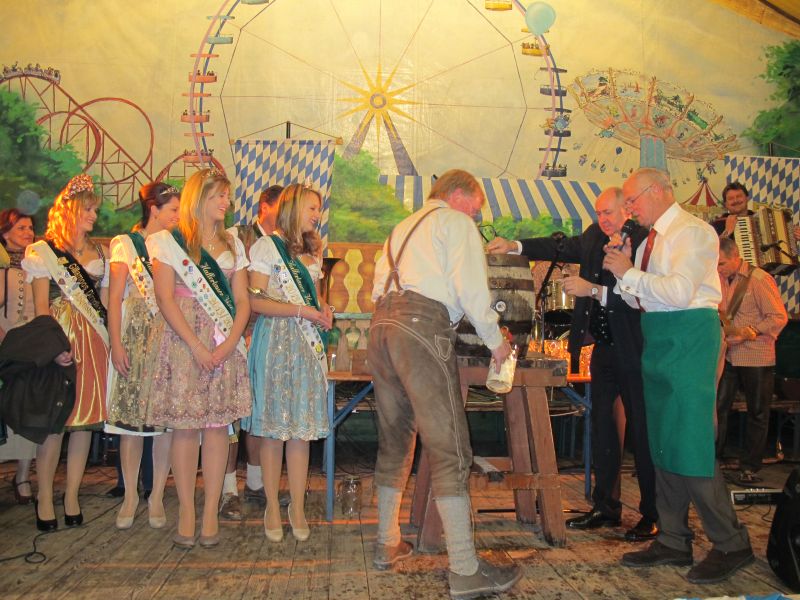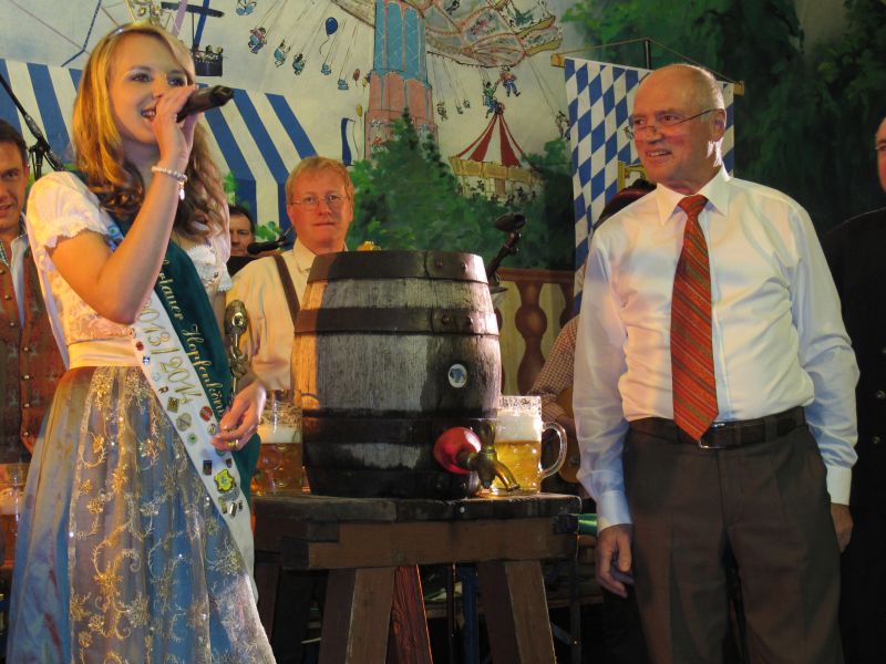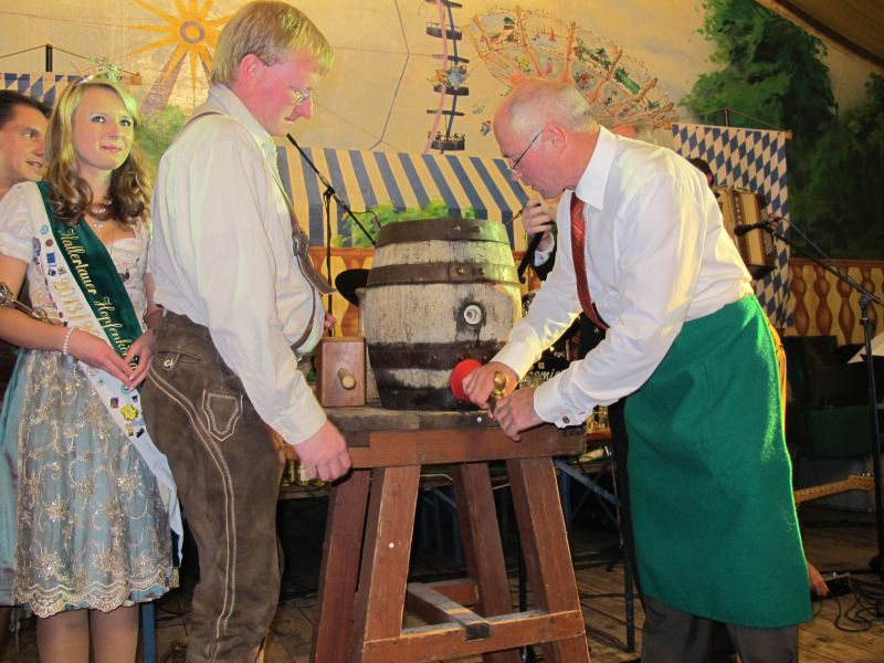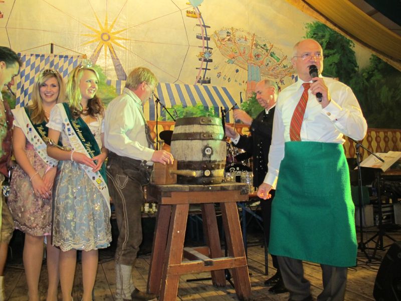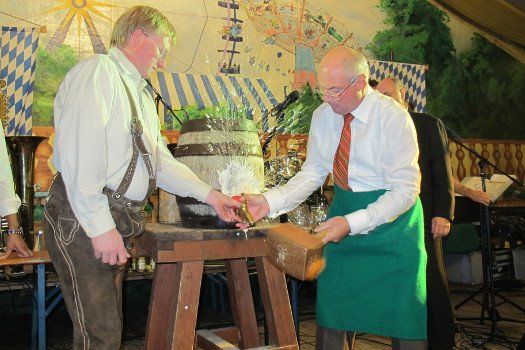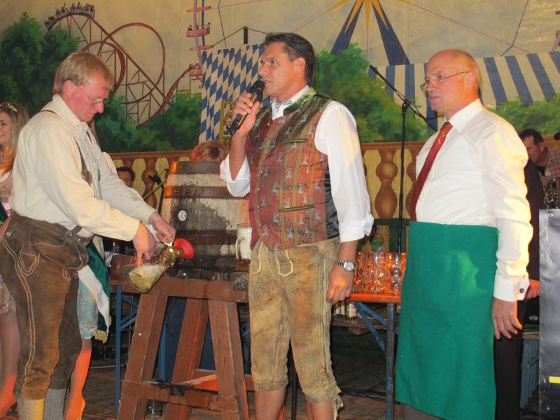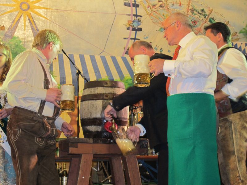 Um 19.00 Uhr machte sich dann Bürgermeister Josef Reiser an die ehrenvolle Aufgabe, anzuzapfen, was auch schon nach dem 2. Schlag gelang. Das Bier spritze und Herr Reiser verkündete stolz: „ O’zapft is!“