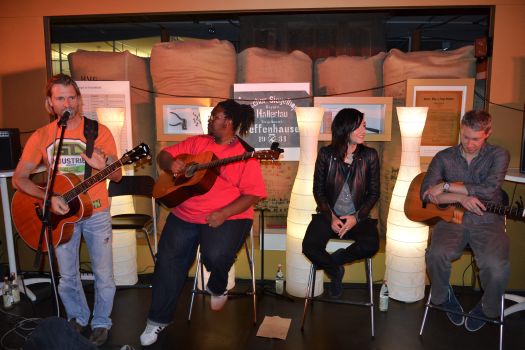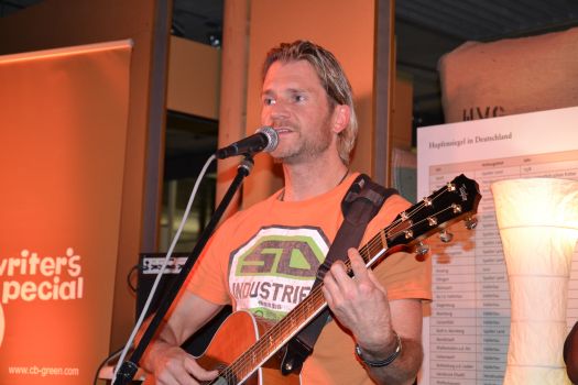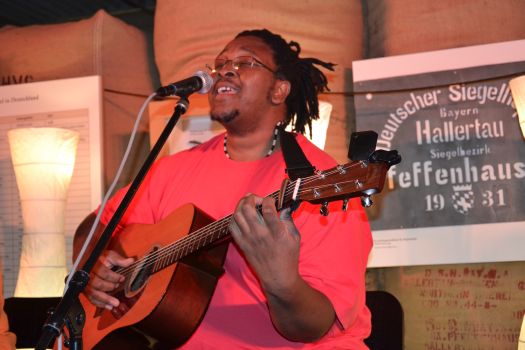 Die technische Ausstattung im Obergeschoss des Hopfenmuseums war für die Künstler minimal, doch der kleine Verstärker und die zwei kleinen Lautsprecher waren voll ausreichend und steigerten das Liveerlebnis. Denn es ging bei der Musik der Künstler nicht um Lautstärke, sondern um Gefühl, das rüberkommen und die Zuhörer berühren sollte. Da es auch keine übliche Bühne gab, war das Erlebnis wirklich besonders (Gänse-)hautnah. Die Künstler wechselten sich nach jedem ihrer Songs ab, gaben das Tonabnehmerkabel und Mikro an den nächsten weiter. Dazwischen immer wieder die launigen Zwischenbemerkungen von C.B. Green, indem er auf die anwesenden Künstler und ihre Songs einging, wie er jeden der einzelnen kennengelernt hatte und was ihn bewogen hatte sie einzuladen. So kennt er den Südafrikaner André de Lang, der inzwischen in Schweden lebt, bereits seit fünf Jahren und hat schon gemeinsam mit ihm musiziert. Die Sängerin Aleen hatte er aufgrund eines Tipps einer Freundin auf youtube angesehen und war von ihr sofort begeistert. Aleen singt sehr gefühlvolle deutsche Songs, während André de Lang englisch und sehr temperamentvoll in seiner Heimatsprache singt. Gerade André schaffte es, mit seinen afrikanischen Songs und Temperament das Publikum mitzureißen und zum mitzusingen zu animieren. So konnten die meisten nach Schluss der Veranstaltung sagen, dass sie einige Brocken seiner afrikanischen Heimatsprache gelernt hatten.