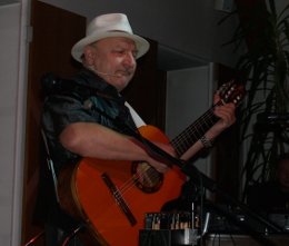 Der umtriebige Niederbayer Rudi Vietz mit Gitarre und Hut gab als erster Künstler an diesem Abend seine etwas schrägen Lieder zum Besten. Seine Fans lieben den urigen Liedermacher, Sänger und Kabarettisten aus Bad Endorf und seine gesungenen Geschichten mitten aus dem Leben.