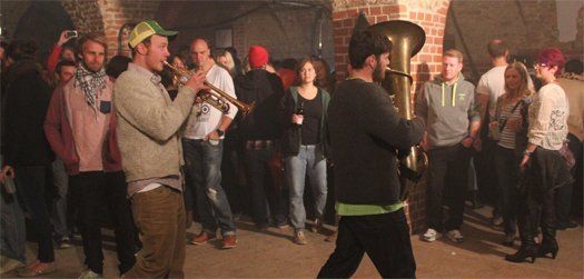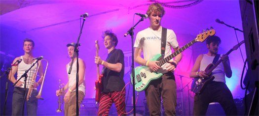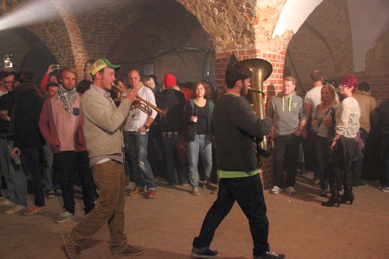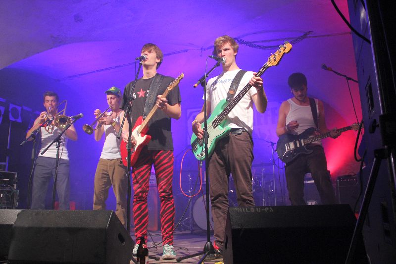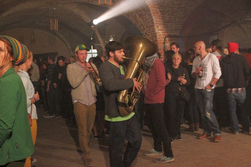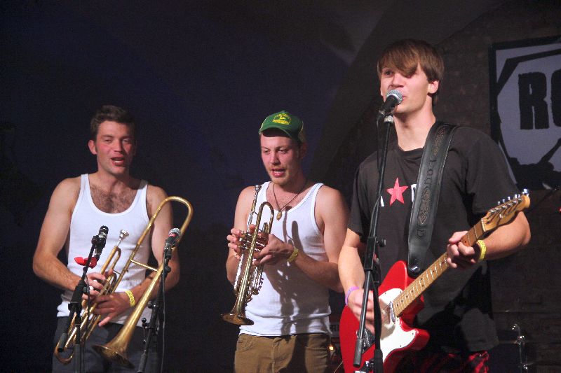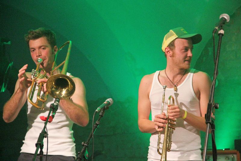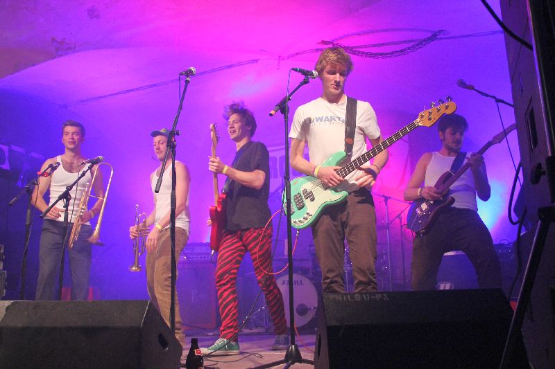 Traditionell mit Tuba und Trompete marschierten sie ein, die Musiker aus dem Inntal. Doch wer in der Folge bayrische Volksmusik erwartet hätte - um ehrlich zu sein: das hat ganz sicher niemand! - der sah sich natürlich getäuscht. Kaum auf der Bühne angekommen, gesellte sich der Rest der Band zu den beiden Bläsern und ab ging die Post. Ska, Rock, Punk, Reggae; wie soll man diese Musik beschreiben für jemanden, der nicht live dabei war? Schon rein optisch wurde nach nur einem Song klar: das wird heiß auf der Bühne. Denn da rissen sich die Jungs bereits die Hemden und T-Shirts von den Leibern, gewissermaßen ein Markenzeichen wie die Barfuß-Auftritte der schon oben zum Vergleich herangezogenen Brass-Vorreiter.