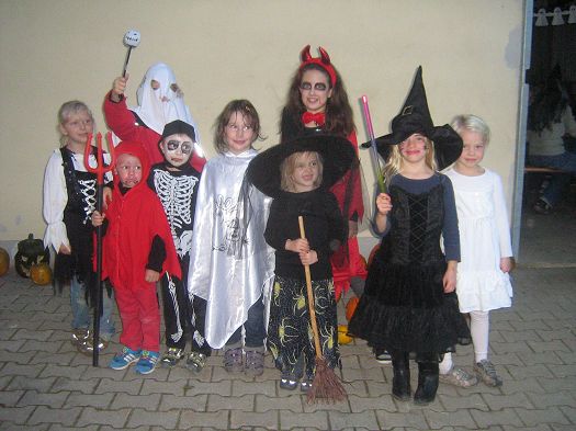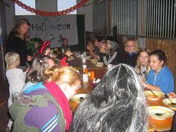 Die Kinder kamen in gruselig -schönen Kostümen, die später dann auch noch prämiert wurden. Außerdem bekam jedes Kind einen Kürbis zur persönlichen Gestaltung, auch diese wurden später prämiert. Im Pferdestall war bereits alles Halloween gemäß geschmückt und an einer großen Tafel nahmen alle Platz und bekamen reichlich zum Essen und Trinken. Die Pferde in den Boxen nahmen den Trubel gelassen hin, die Eltern nutzten die Zeit zu einem Pläuschchen.