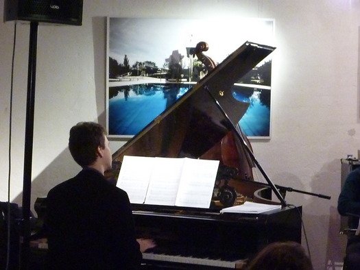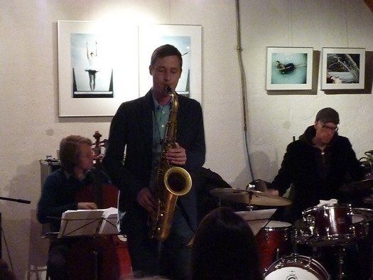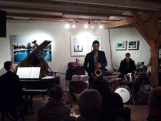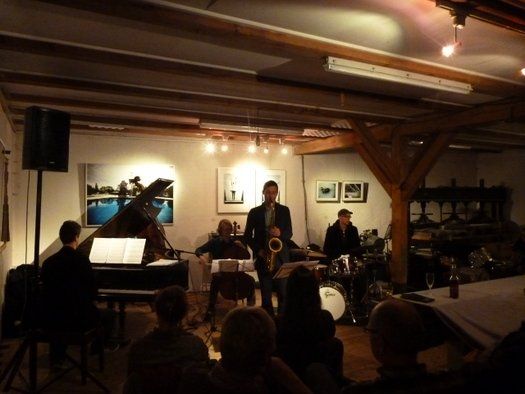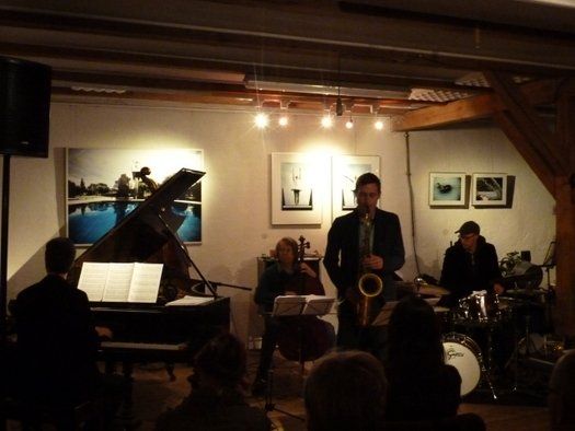 Das Till Martin Quartett lieferte anschließend noch die perfekte musikalische Kulisse zu der Ausstellung. Die Linien in der Musik von Till Martin sind den Perspektiven des Fotografen nicht unähnlich. Der Liederzyklus "Regarding a line" des Quartetts basiert auf einer einzigen Melodie. Alle Kompositionen entstanden ausgehend von ihrer Tonfolge. Sie zieht sich subtil durch den Abend und ändert dabei von Stück zu Stück ihre Funktion. Sie erklingt als barocke Miniatur, schlüpft in die Gestalt eines mittelalterlichen Tanzliedes, schlägt die Brücke zu Duke Ellington und trifft immer wieder auf zeitgenössischen Jazz. (aus der Beschreibung der neuen CD "Regarding a line").