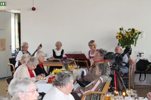 Der Veranstaltungssaal war mit viel Liebe zum Detail mit frischen Herbstblumen und Sonnenblumen, Maiskolben, Kastanien und Kürbissen dekoriert. Für die Bewohner spielte wieder die Wind`ner Stubenmusik. Mit Liedern auf Gitarre, Hackbrett und Zither machten die Musiker den Altenheimbewohnern viel Freude und die bedankten sich mit riesigem Beifall für die musikalische Darbietung.