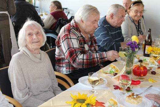 Der Küchenchef und sein Team verwöhnten die Senioren mit einem deftigen Zwiebelkuchen und dazu schmeckten Wasser und Wein besonders gut. Alle Bewohner genossen sichtlich das gelungene Fest und versprachen, nächstes Jahr auf alle Fälle wiederzukommen.