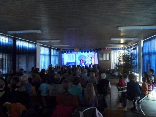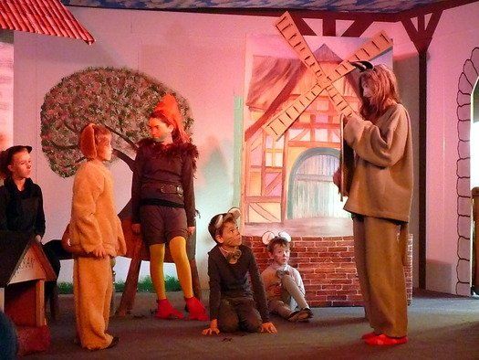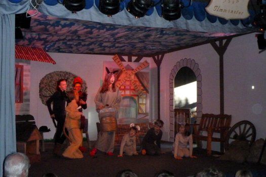Eine romantische Wiese, echte Bäume im Hintergrund, veränderbare Wegweiser und eine alte Mühle, die ganze Aula der Schule Ilmmünster scheint das Bühnenbild zu den Bremer Stadtmusikanten zu sein. Auf- und Abgänge sind entsprechend organisiert, das vorwiegend junge Publikum kann praktisch mitspielen. Die vielen Mäusedarsteller haben ihre liebe Not, aus ihrer Position der Handlung zu folgen. Das auf den vielen Ebenen angelegte schnelle Spiel macht allen Beteiligten sichtlichen Spaß. Die Musikeinlagen und die Beleuchtung sind perfekt eingespielt und geschaltet, der Gesang ist einfühlsam und hörbar.