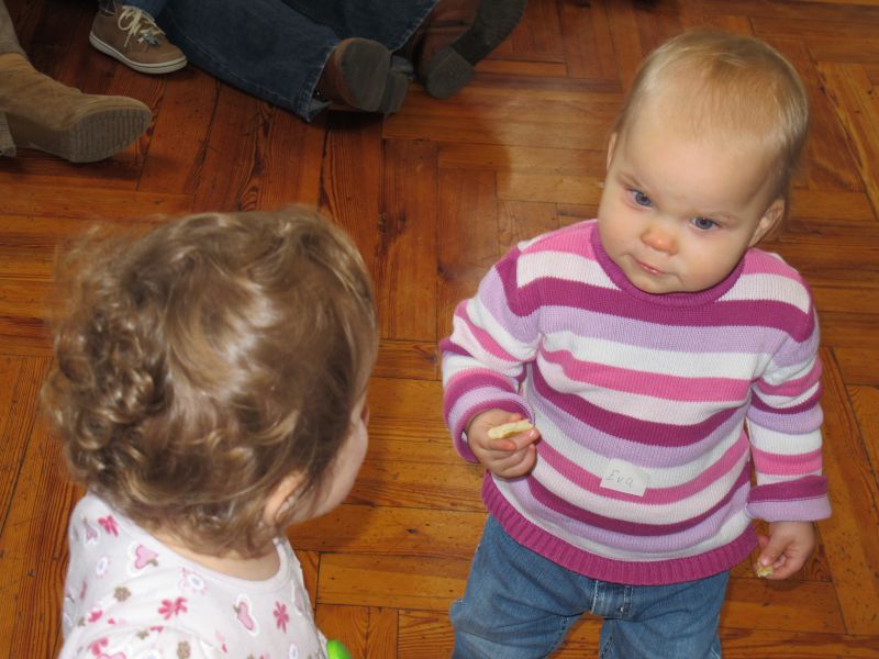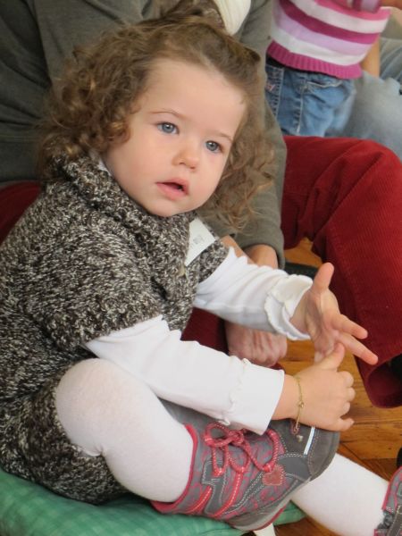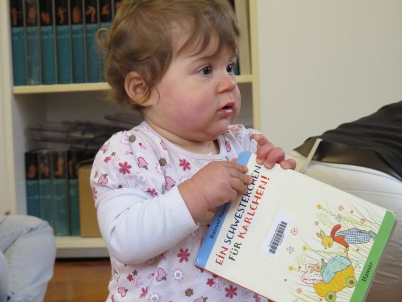 Zu Beginn jeder Vorlesestunde wurde wie immer erst einmal das Lied: „Wuff, Wuff, komm raus aus Deiner Hundehütte…..“ gesungen, um das Maskottchen aufzuwecken. Mit Begeisterung sangen die zwölf Krabbelkinder mit und klatschten voller Freunde in die Hände, als „Wuff“ mit einem Bellen aus der Hundehütte kam.
