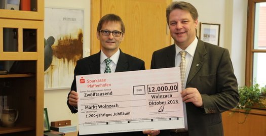 „Diese ganz besondere Jubiläumsmedaille macht uns natürlich sehr stolz“, so Bürgermeister Jens Machold, der sich in diesem Zusammenhang für die gute Zusammenarbeit im Hinblick auf die ganzen Feierlichkeiten bei der Sparkasse bedankte. Doch Norbert Lienhardt hatte seitens der Sparkasse noch mehr im Gepäck, neben der Münze überreichte er der Gemeinde auch einen Scheck über 12.000 Euro. „Dieses Festprogramm ist einfach einzigartig und wir wollen dies aus Sicht der Sparkasse auch entsprechend unterstützen.“ Dem blieb auch am Ende nichts mehr hinzuzufügen, als mit einem Glas Jubiläumssekt auf die kommenden zwölf Monate anzustoßen.