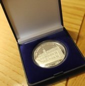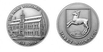 „Wir sind von diesem Gesamtkonzept sehr beeindruckt“, so Norbert Leinhardt, Vorstandsvorsitzender der Kreissparkasse. So entstand eben nicht nur der Wunsch sich als Partner an dem Gesamtprojekt zu beteiligen, sondern aus diesem Anlass eine Jubiläumsmedaille herauszugeben. In Zusammenarbeit mit der Firma Nobel House aus Hilpoltstein entstand so eine Silbermünze, die auf der einen Seite das Wolnzacher Wappen und auf der anderen Seite das Rathaus zeigt. „Die Münze hat einen Durchmesser von 35 Millimeter und ist aus Feinsilber“, erklärt Birgit Distler, von der Sparkasse, die zusammen mit Norbert Lienhardt und Reinhardt Ermer von der Firma Nobel House dem Markt Wolnzach die erste Münze überreichen durften. Insgesamt wurden 600 Münzen geprägt, und sind sowohl in Gold, wie auch in Silber in der Wolnzacher Filiale erhältlich.