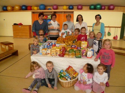 Mit großem Eifer haben die Kinder Nudeln, Kartoffeln, Milch und viele andere Produkte des täglichen Gebrauchs von zu Hause mitgebracht. Und so konnte die Leiterin Betty Kuffer zusammen mit Erzieherinnen und Kindern eine beachtliche Palette an Nahrungsmittel an Anneliese Brunner und Rosemarie Gaffal von der Mainburger Tafel übergeben. Für die Kinder war es teilweise das erste Mal, dass sie mit der Thematik in Verbindung kamen, dass für viele Menschen auch in Mainburg der täglich reich gedeckte Tisch keine Selbstverständlichkeit ist. Vielleicht bewegt diese Aktion ja auch andere Institutionen, die Spendenbereitschaft der Eltern und Kinder nachzuahmen, denn wie schon St. Martin lehrt: "Teilen macht Freude".