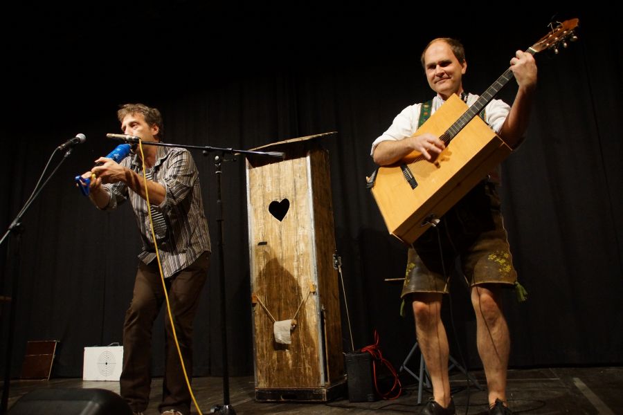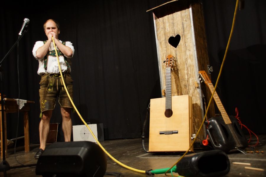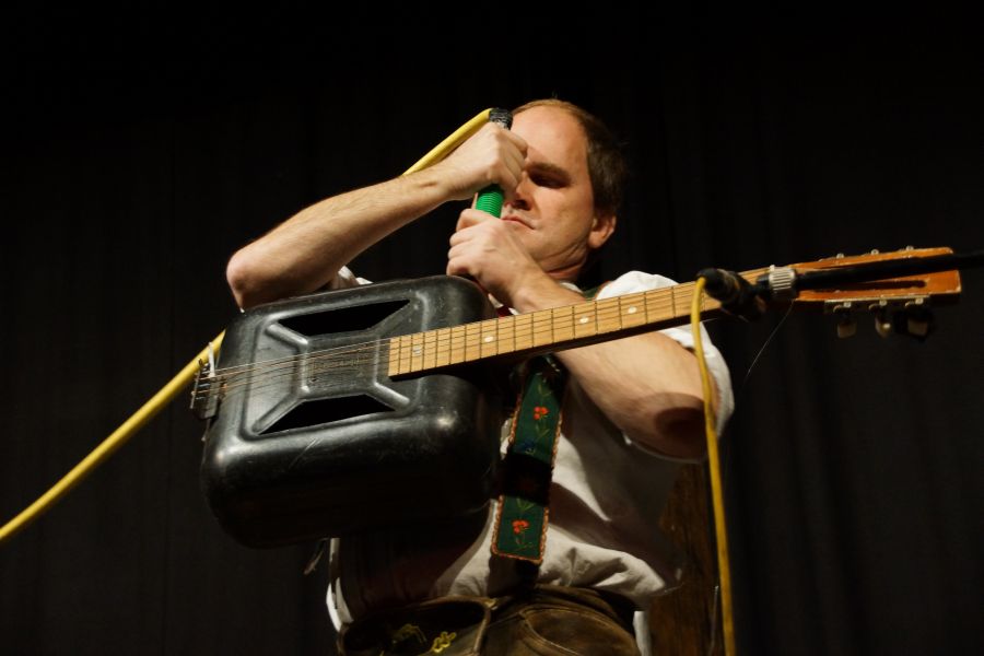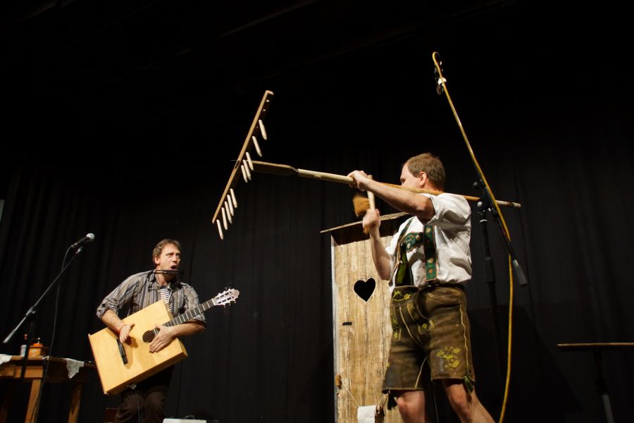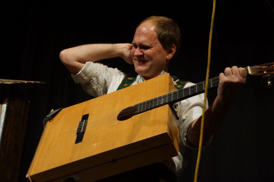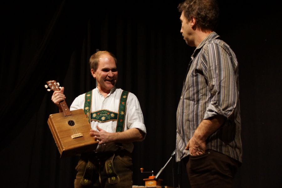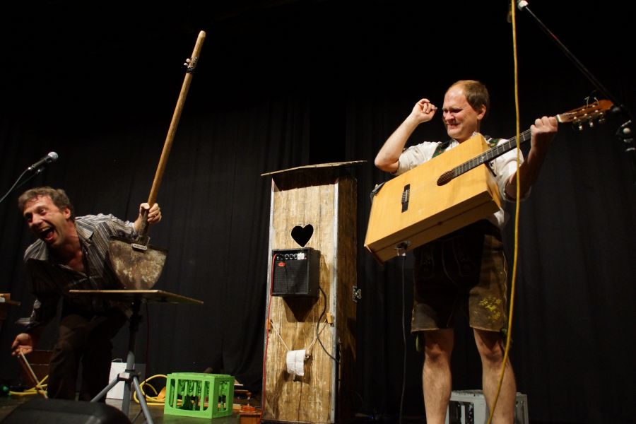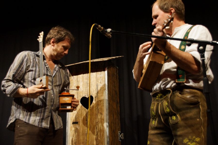 Dabei schauten erst die meisten etwas zweifelnd auf die Bühne, denn auf der standen nur ein Klohäuschen und ein alter Tisch mit einer Kaffeemühle darauf. Erstes Gelächter war aus dem Publikum zu hören, als Michi mit einer Schublade auftauchte, die mit Gitarrensaiten bespannt war.