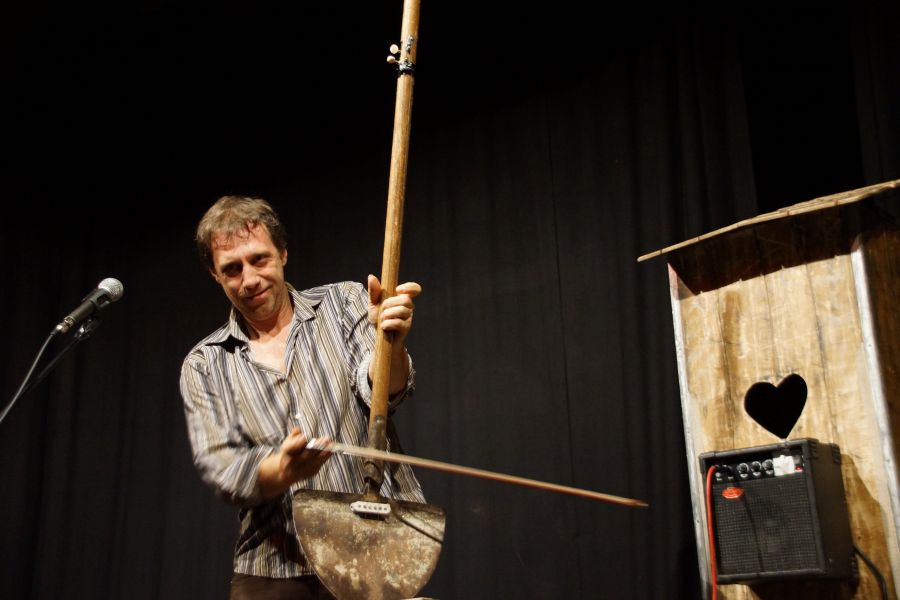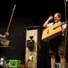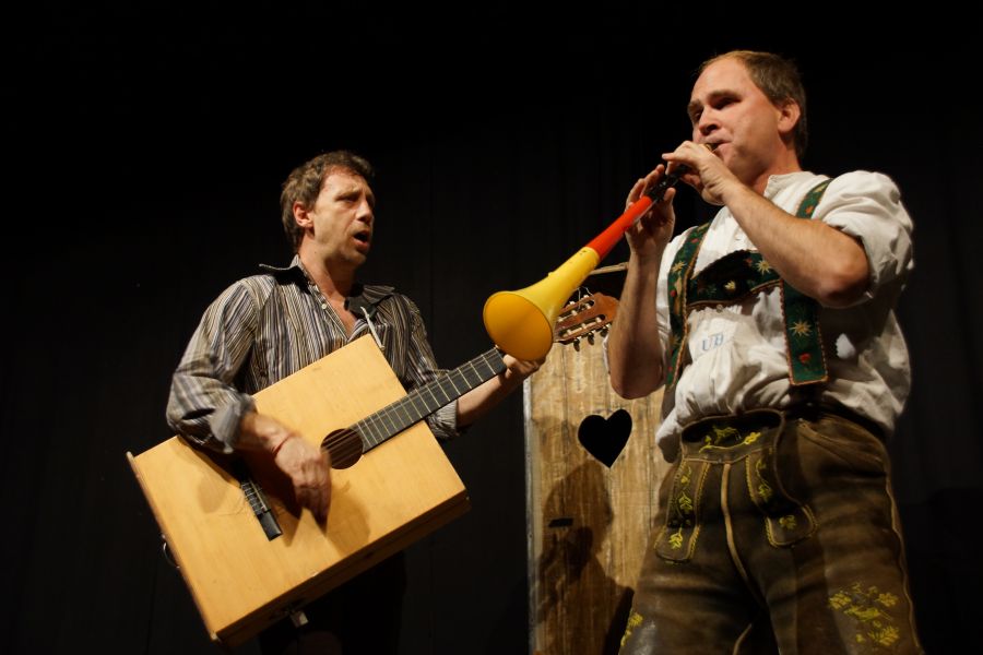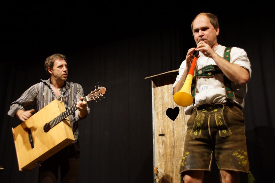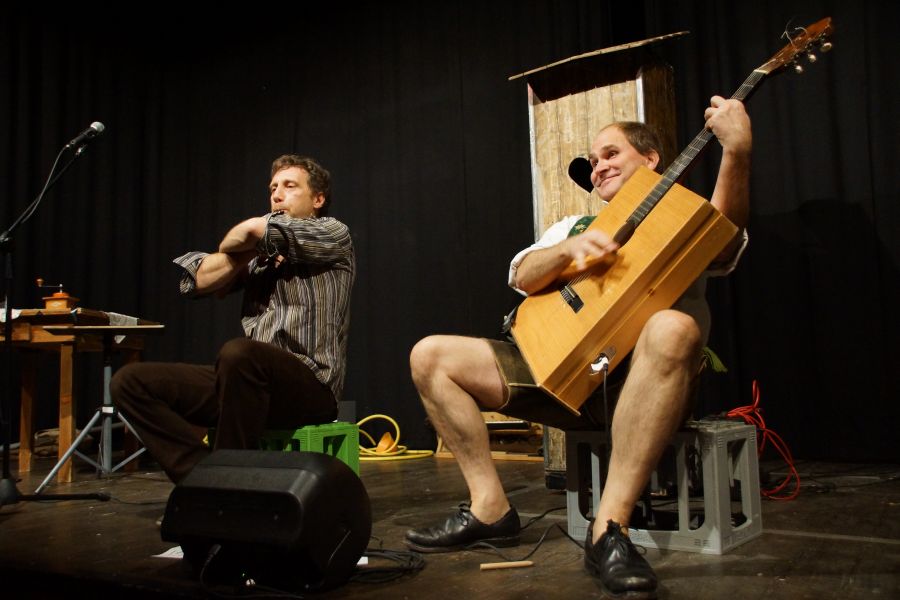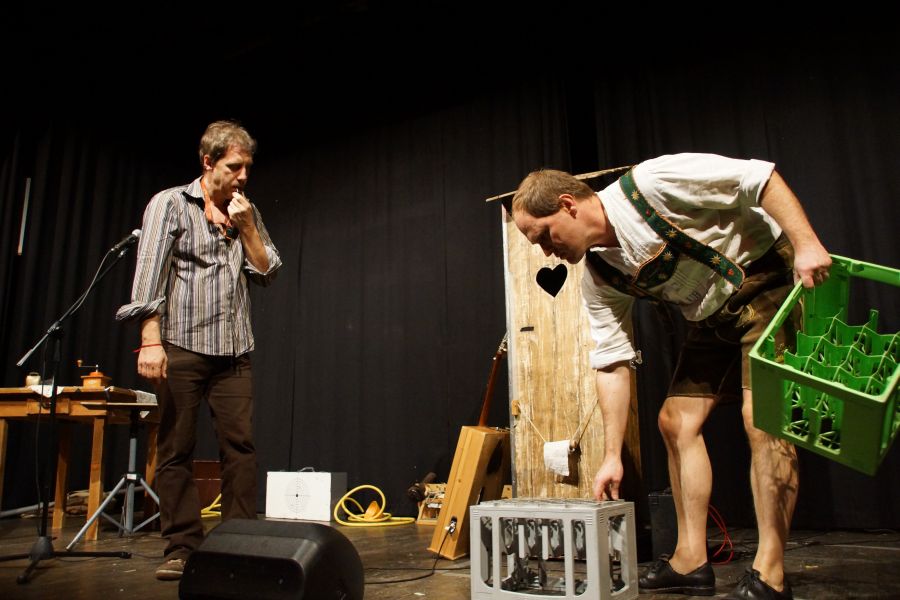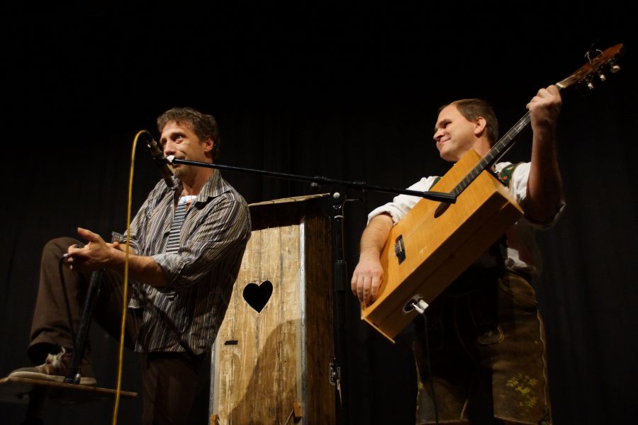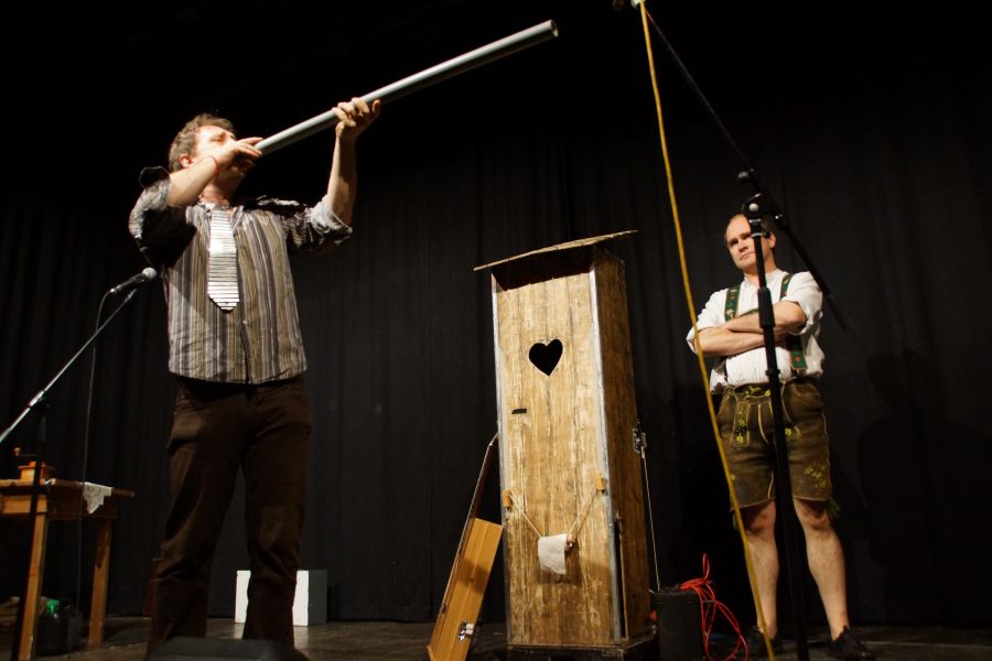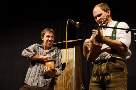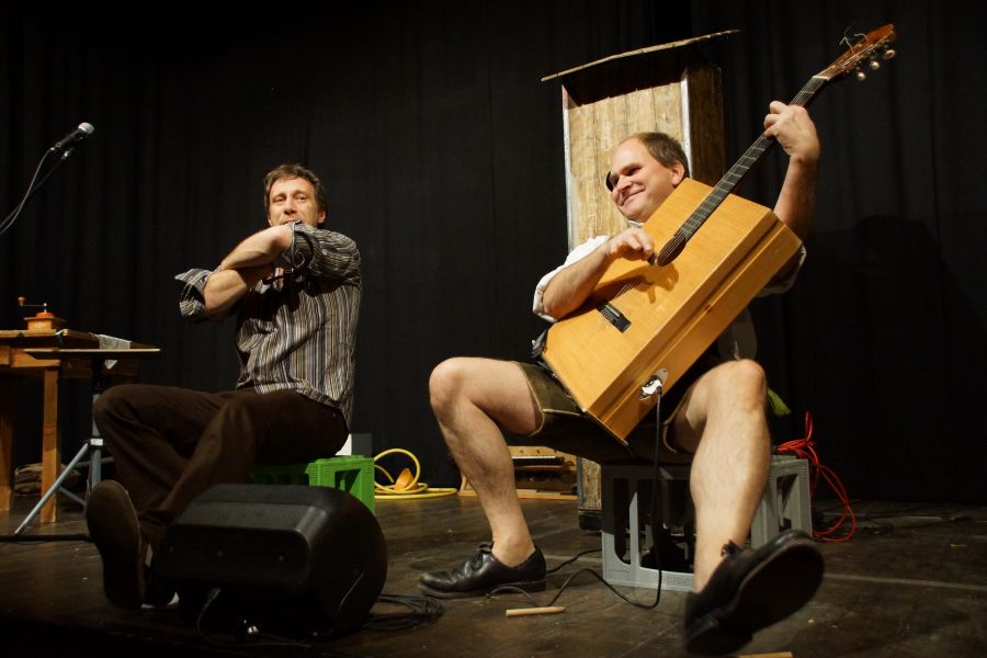 Dabei schauten erst die meisten etwas zweifelnd auf die Bühne, denn auf der standen nur ein Klohäuschen und ein alter Tisch mit einer Kaffeemühle darauf. Erstes Gelächter war aus dem Publikum zu hören, als Michi mit einer Schublade auftauchte, die mit Gitarrensaiten bespannt war.