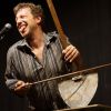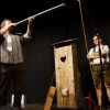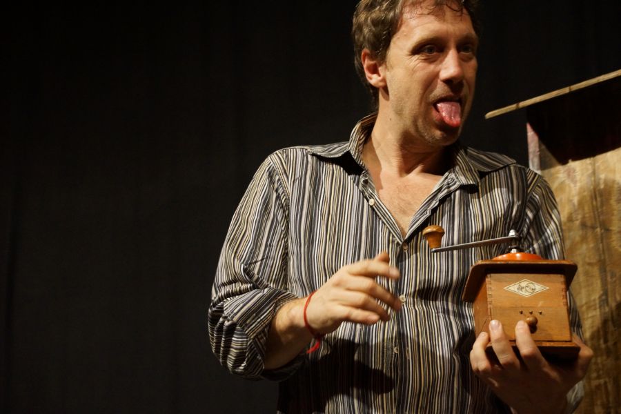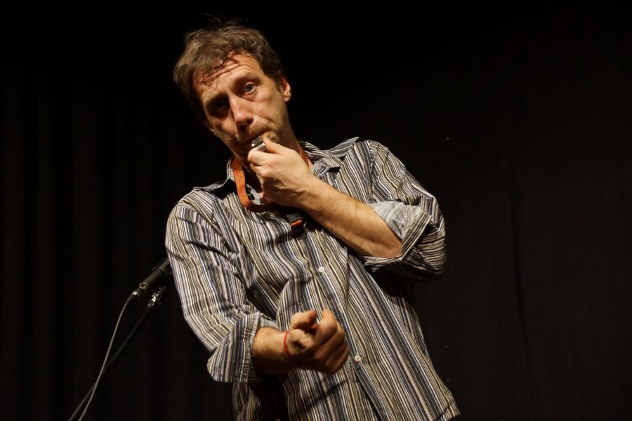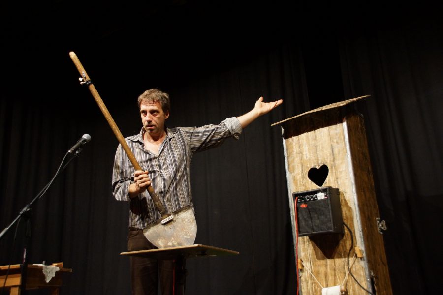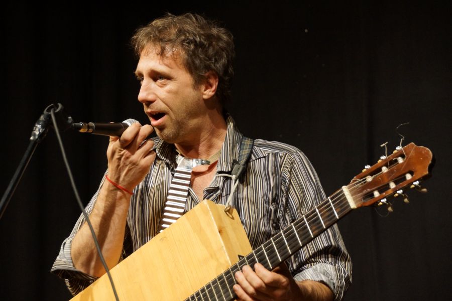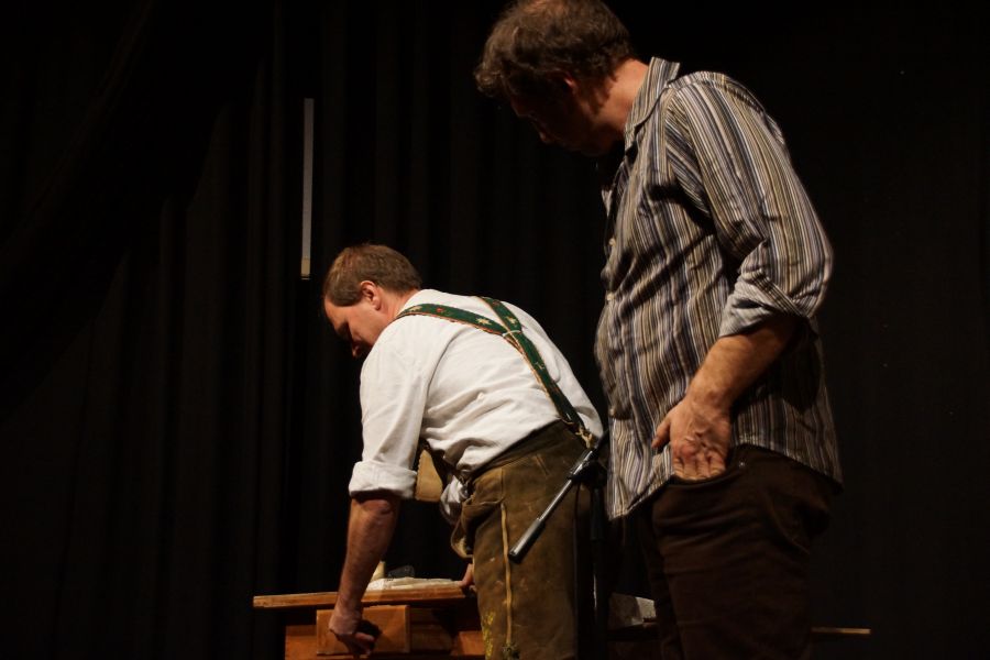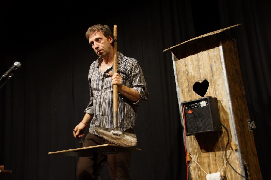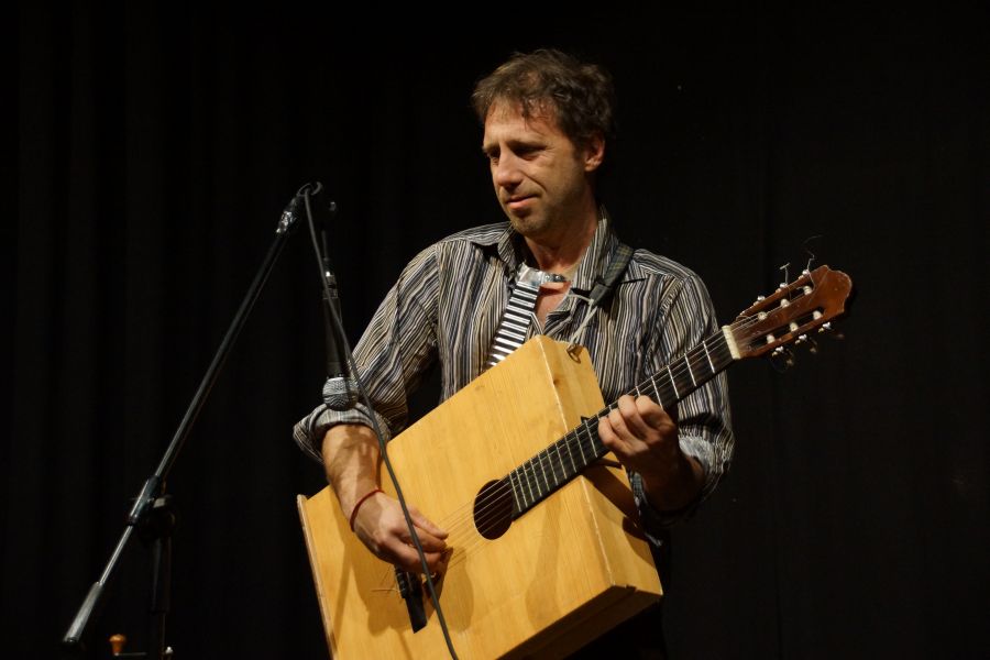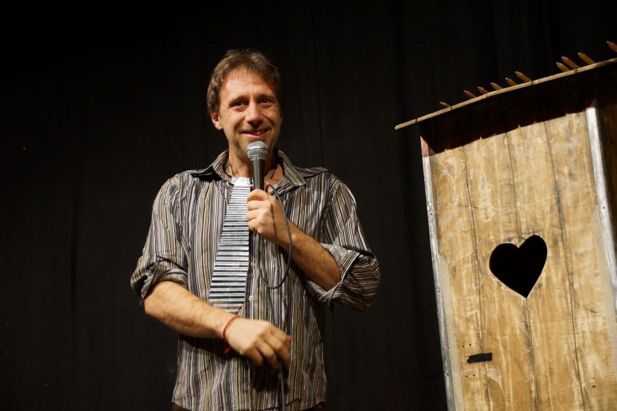Dabei schauten erst die meisten etwas zweifelnd auf die Bühne, denn auf der standen nur ein Klohäuschen und ein alter Tisch mit einer Kaffeemühle darauf. Erstes Gelächter war aus dem Publikum zu hören, als Michi mit einer Schublade auftauchte, die mit Gitarrensaiten bespannt war.