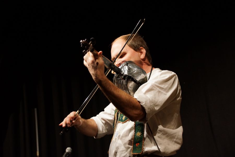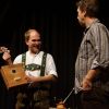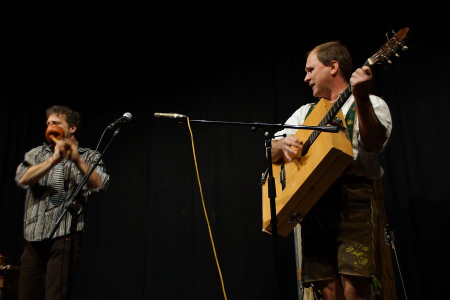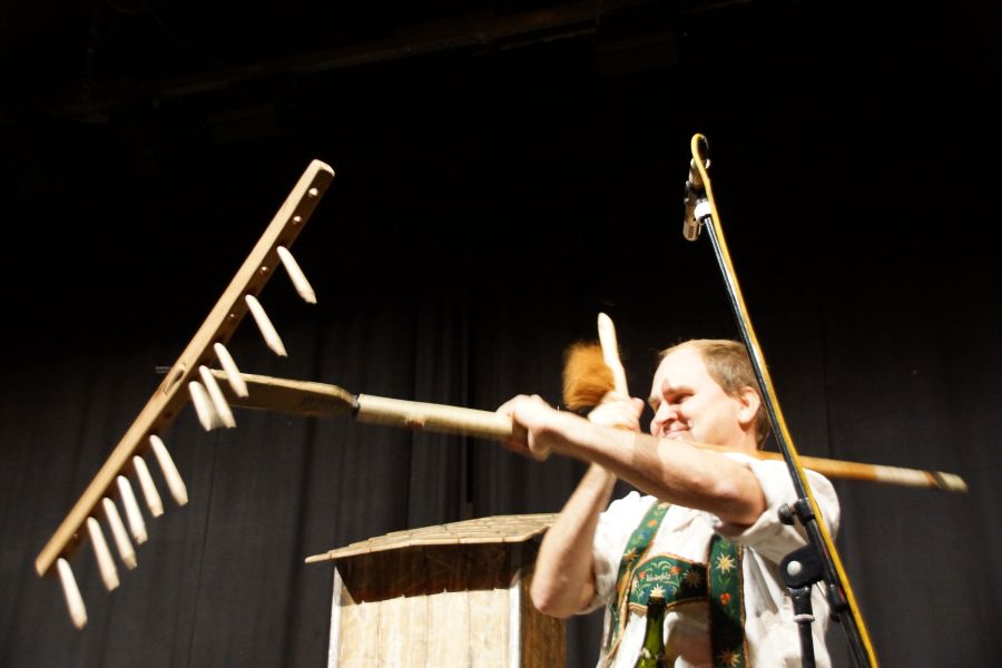 Als dann aber Juri auf die Bühne trat, brach schallendes Gelächter aus. Mit einem Heurechen und einem Kehrbeserl bewaffnet legte er los, begleitet von der Schubladengitarre, hämmerte darauf herum, dass die Zacken aus dem Rechen im hohen Bogen in den Zuschauerraum flogen.