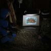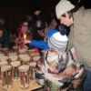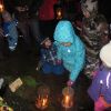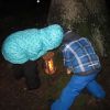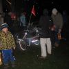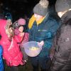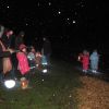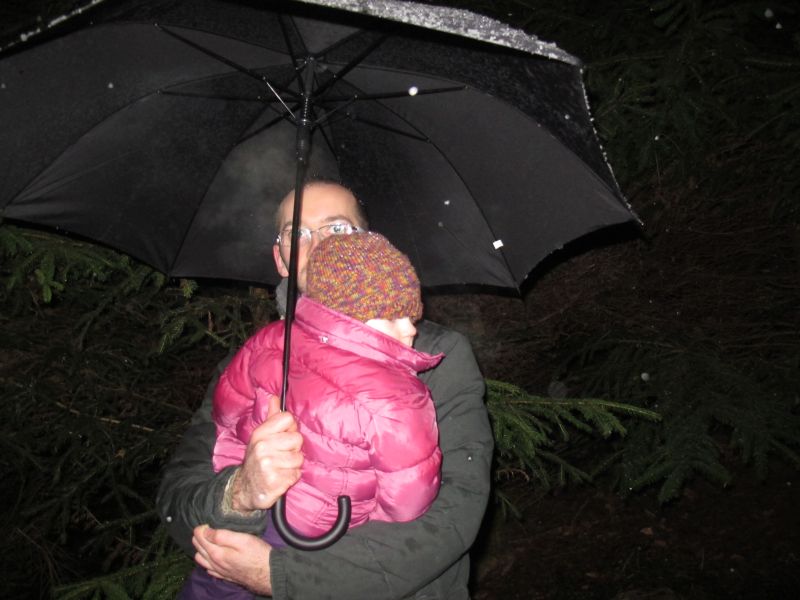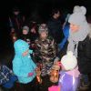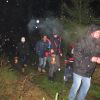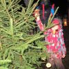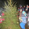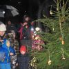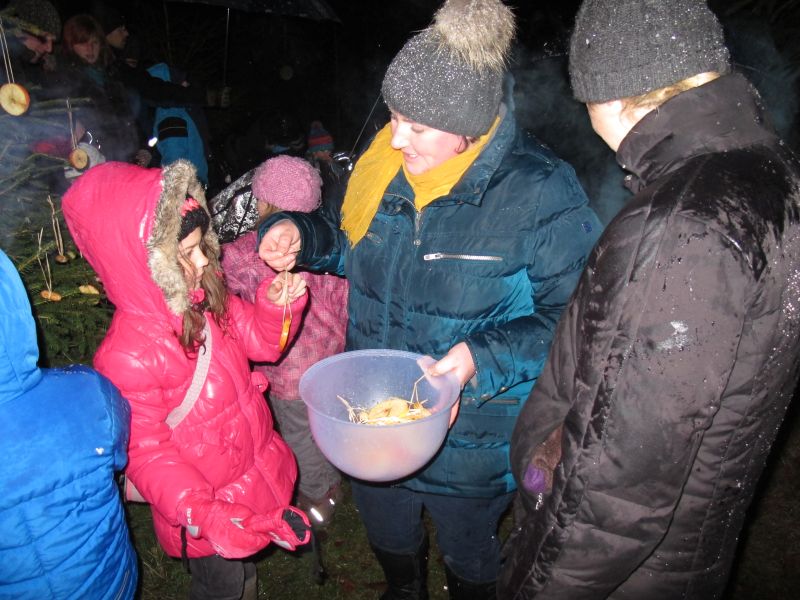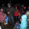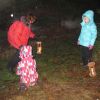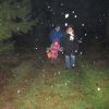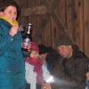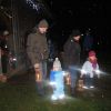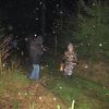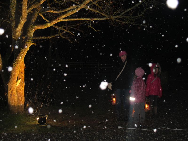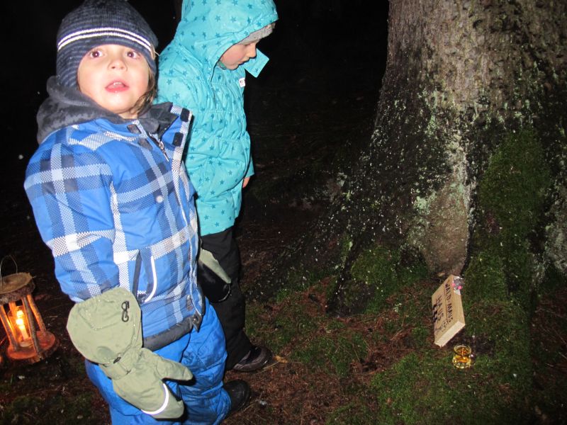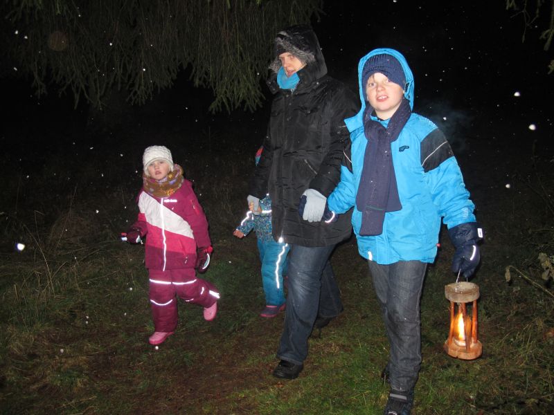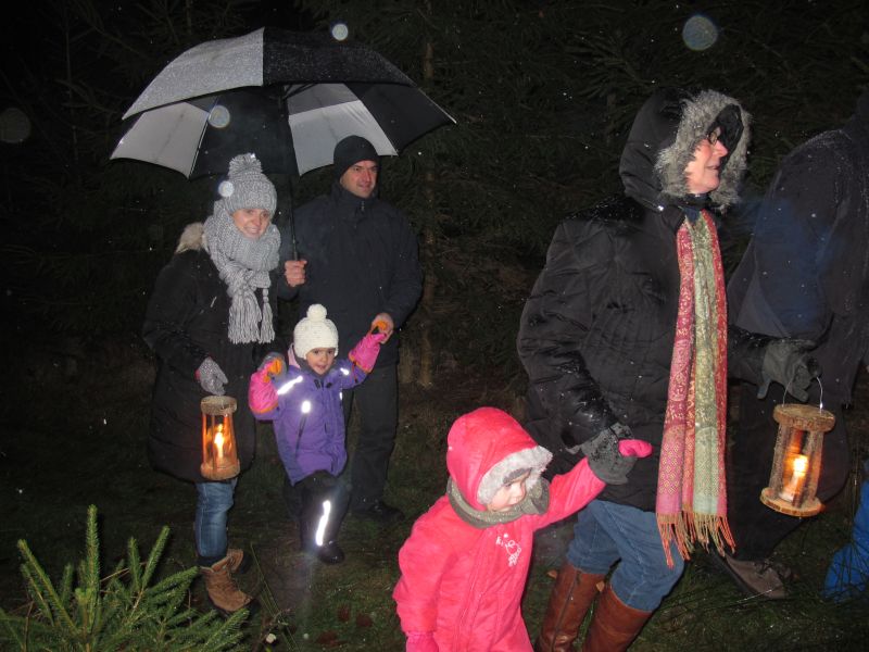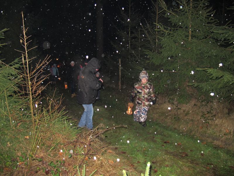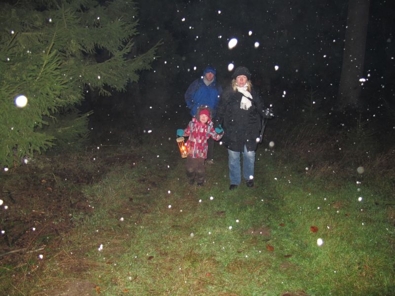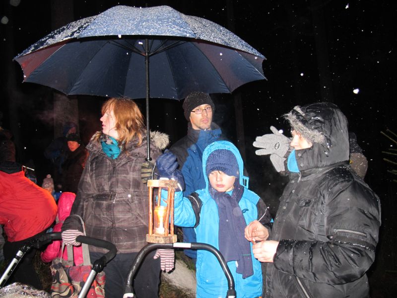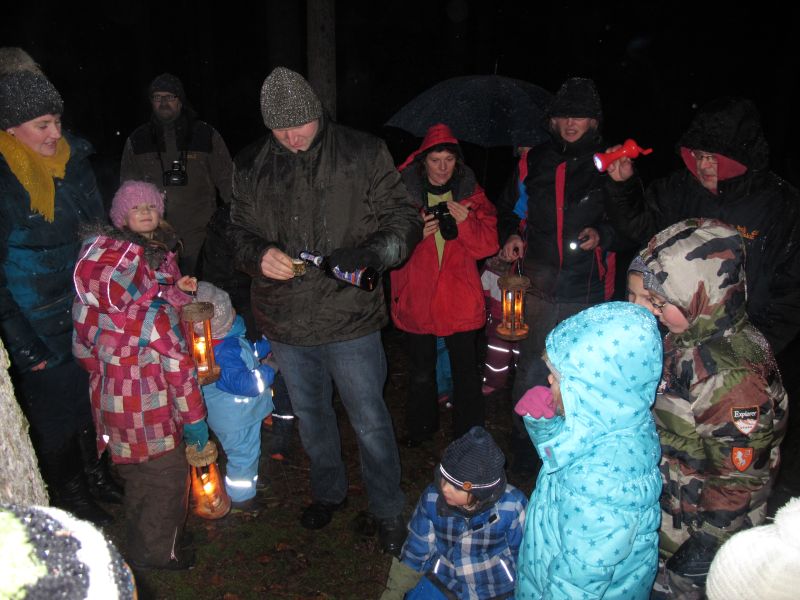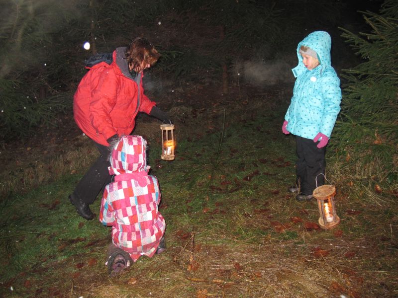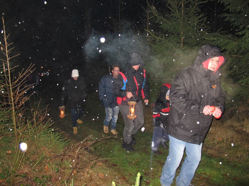 Mit Laternen „bewaffnet“ und natürlich dem Bier und dem kleinen Glas, zog die ganze Gesellschaft im Stockdunklen und bei leichtem Schneefall in den nahen Wald. Dort angekommen, wurde erst mal der Waldmaus ein Besuch abgestattet und sie bekam auch das versprochene Glas Bier.