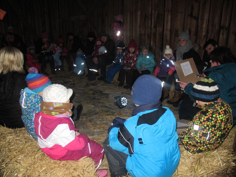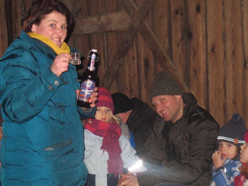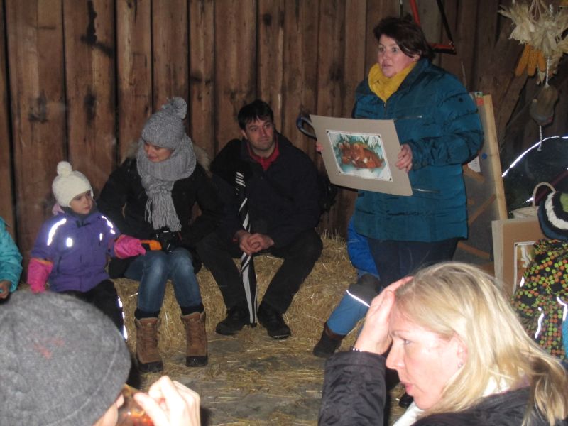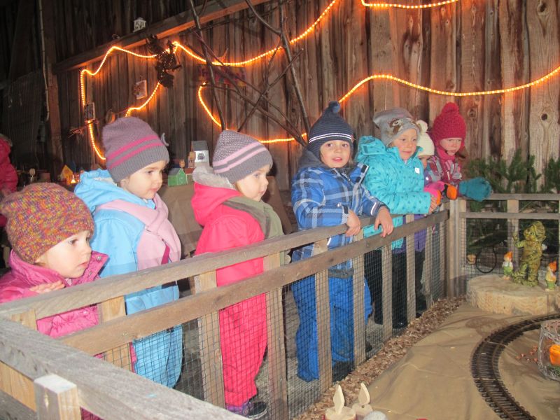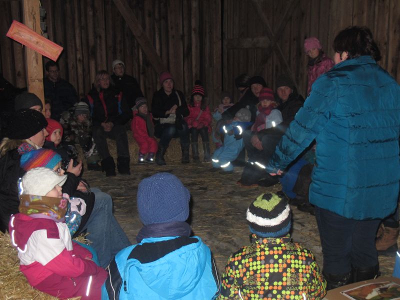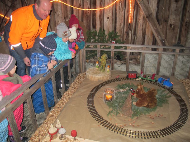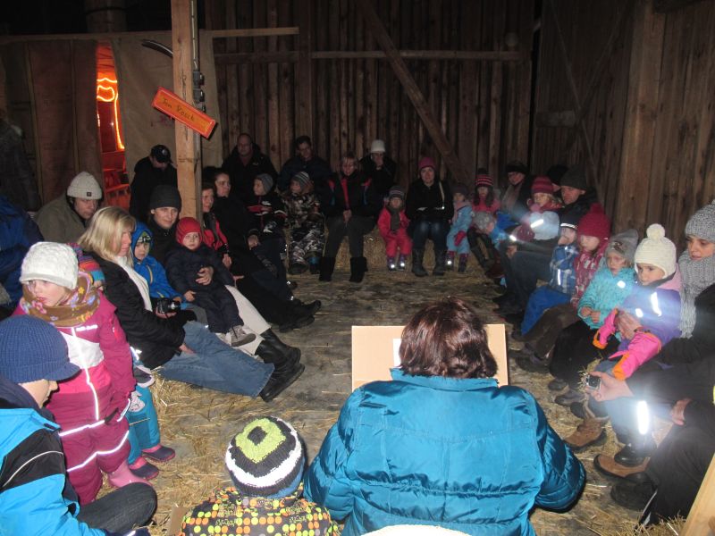 An die 25 Kinder von 0 – 9 Jahren waren mit ihren Eltern zu Besuch bei der Familie Resch, die wie immer alles sehr liebevoll für ihre Gäste vorbereitet hatte. Im romantischen Stall standen Laternen für die Wanderung in den nahen Wald bereit, eine Holzstadt konnte von den Kleinen bewundert werden und eine Eisenbahn zog ihre Kreise.