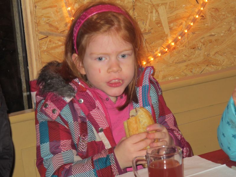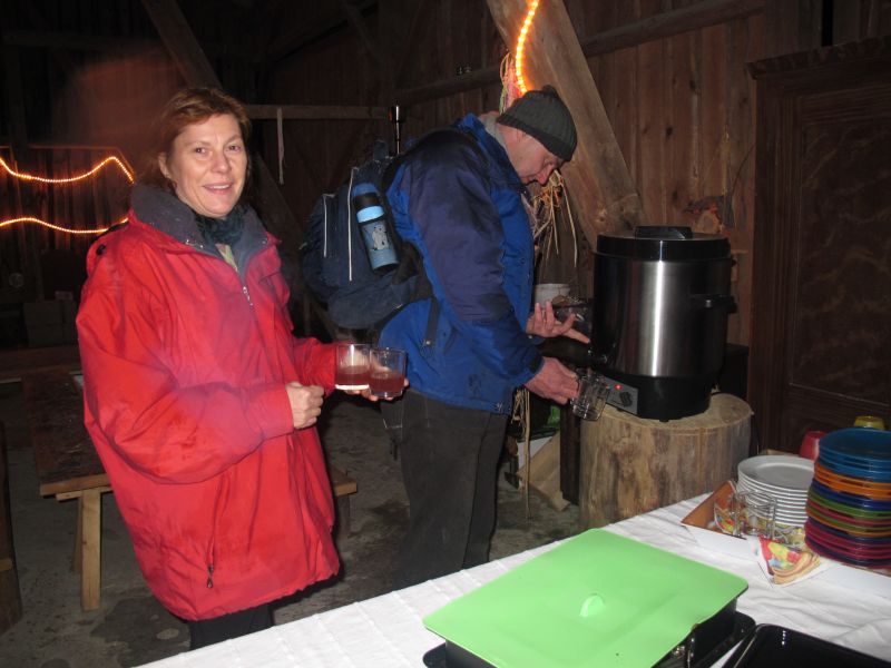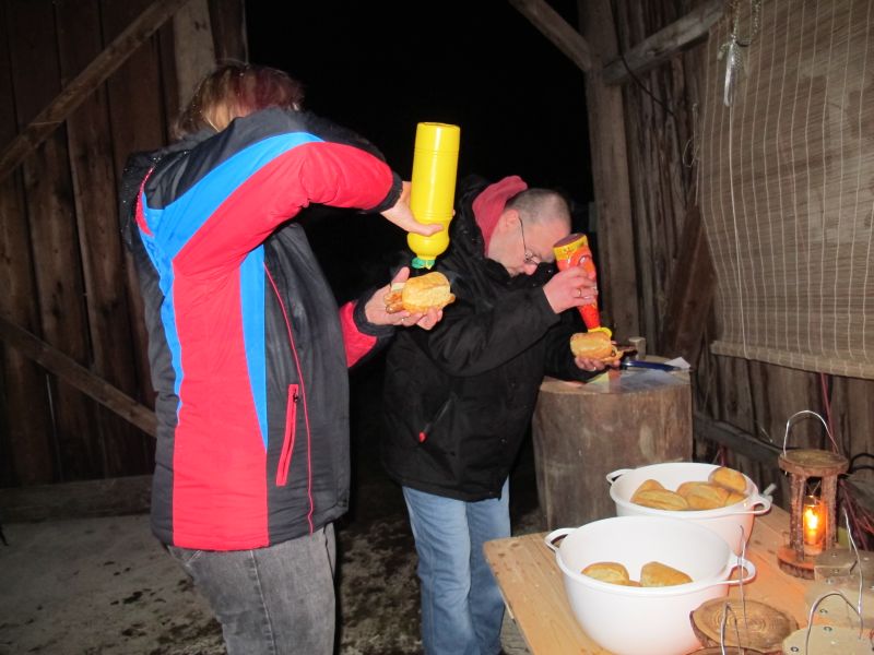 Ziemlich durchgefroren marschierten die fleißigen Helfer des Christkinds wieder zurück in den warmen Stall und wurden dort von leckerem Geruch erwartet. Herr Resch hatte in der Zwischenzeit den Grill angeheizt und die ersten Schweinswürschtel waren schon fertig, auch Kinderpunsch und frische Kierchen waren bereit gestellt.