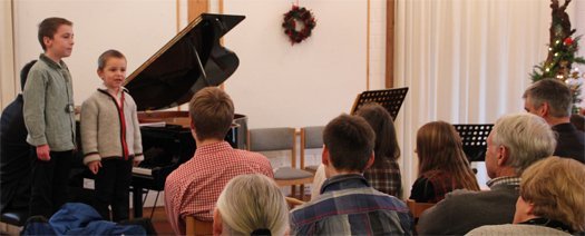 Neben teilweise von Micha Haupt speziell arrangierten Stücken von Johann Sebastian Bach und Felix Mendelssohn-Bartholdy gab es in seinem persönlichen Programmteil auch wieder eine Kostprobe eigener Kompositionen, im Zusammenspiel mit Geschwistern und Eltern aber auch einige traditionelle Weihnachtslieder, in die die gesamte Gemeinde einstimmte.