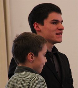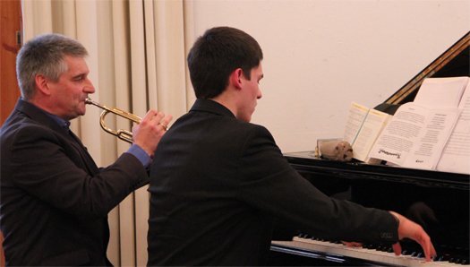 Schon mit 14 Jahren begann Micha Haupt neben dem Besuch der Schule ein Studium für Komposition an der Hochschule für Musik in München. Er ist Gewinner zahlreicher Preise sowohl in Komposition als auch in Orgel und Klavier. Und er ist — wie am Samstag deutlich wurde — musikalischer Leiter und Arrangeur seiner jüngeren Geschwister. Gemeinsam mit ihm musizierten nämlich noch Rahel (11, Querflöte), Esra (9, Violine) sowie Matthias (13) und Simon (17) an den Trompeten. Diese seien allerdings noch nicht alle so virtuos auf ihren Instrumenten, bat der Vater der Familie Haupt schon vor Konzertbeginn um Verständnis bei etwaigen Misstönen; es sei in Teilen des Konzers eben eine "Haupt-Probe".