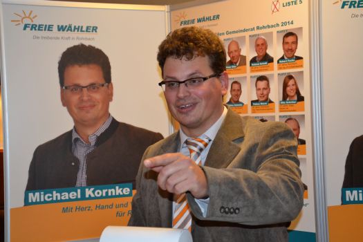Bürgermeisterkandidat Michael Kornke startete in seinem Beitrag mit einem Profilvergleich der Bürgermeisterkandidaten und des jetzigen Amtsinhabers nach den Kriterien Verwaltungsausbildung, Verwaltungs-erfahrung, technischer Ausbildung und Erfahrung in der „freien“ Wirtschaft. In allen Punkten kam er als bester Kandidat heraus. Als Schwerpunktthemen der Freien Wähler stellte er heraus: eine stärkere Bürgerbeteiligung, auch mit der Möglichkeit der online-Abstimmung, Bürgerforen, feste Sprechzeiten des Bürgermeisters, Verbesserung der Infrastruktur (sicheres Trinkwasser, Radwege zu den Ortsteilen, Breitbandverkabelung, moderate Entwicklung der Wohngebiete), Hochwasser und Katastrophenschutz, Energiewende (Umsetzung des Gemeinde-Energienutzungsplanes, Zuschüsse für einen Energiepass, Bürgergenossenschaften für mehr unabhängige Energieversorgung) Förderung von Kultur und Vereinen, besonders auch der Jugendarbeit, stärkeres Augenmerk auf die Senioren (zentrale Anlaufstelle im Rathaus für Seniorenfragen, Bürgerbus als Einkaufshilfe, Mehrgenerationenhaus und Betreuung im bisherigen Wohnumfeld). Kornke sah sich in all diesen Punkten mit seinen Kandidatenkollegen gut aufgestellt und war zuversichtlich für die Wahl.